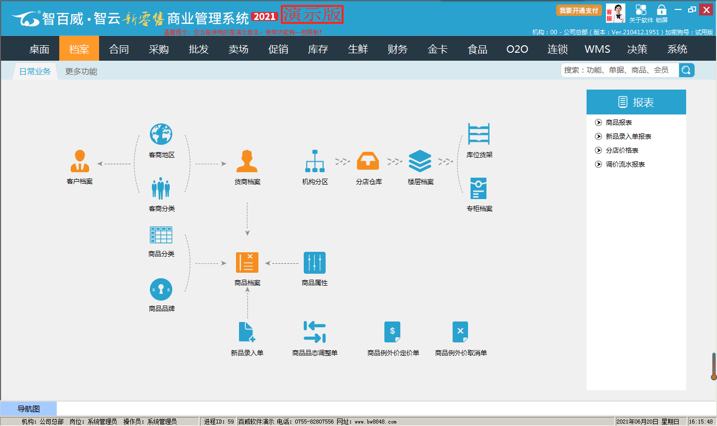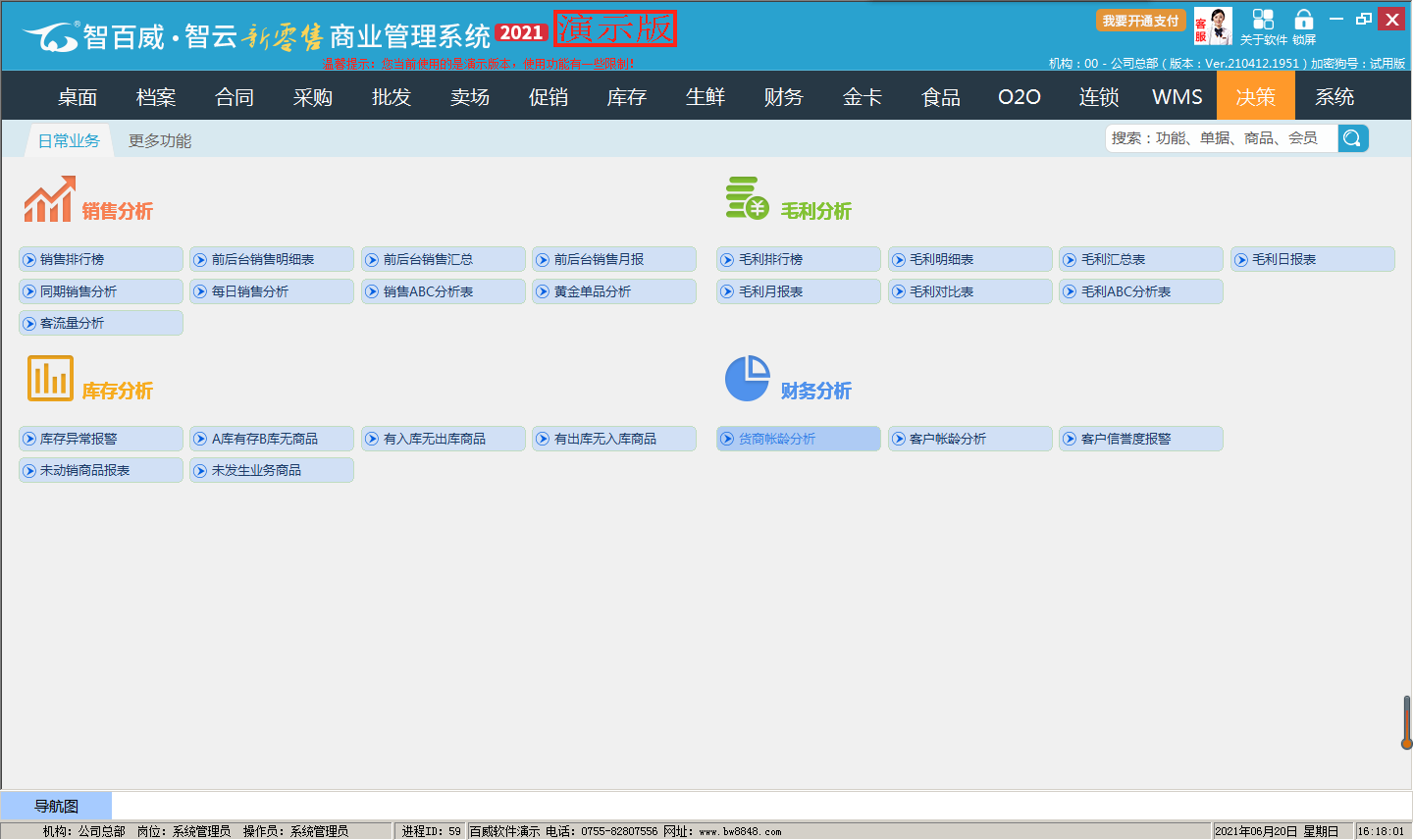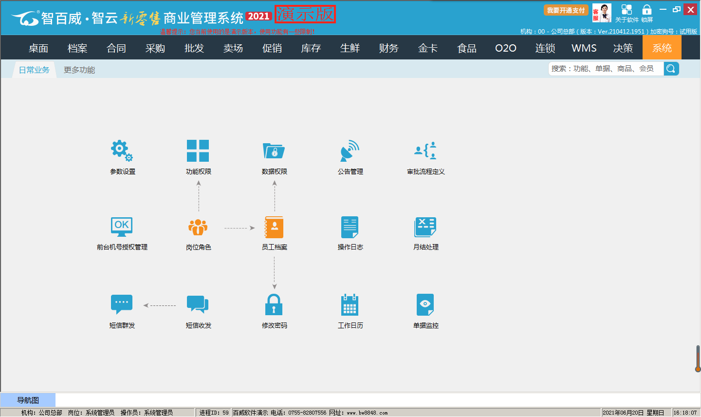 智百威新零售系統(tǒng)后臺分為十六個功能模塊+前臺收銀模塊,精細(xì)化的可以管理到企業(yè)的每個流程,為企業(yè)/門店提供專業(yè)的進、銷、存管理