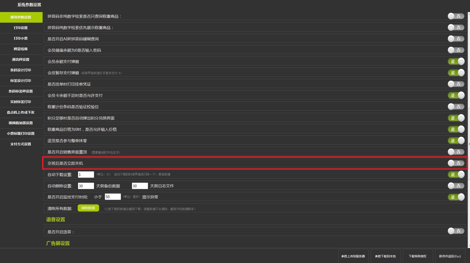 05 威云前臺系統(tǒng)通用參數(shù)增加了交班后是否立即關(guān)機(jī)的參數(shù)功能