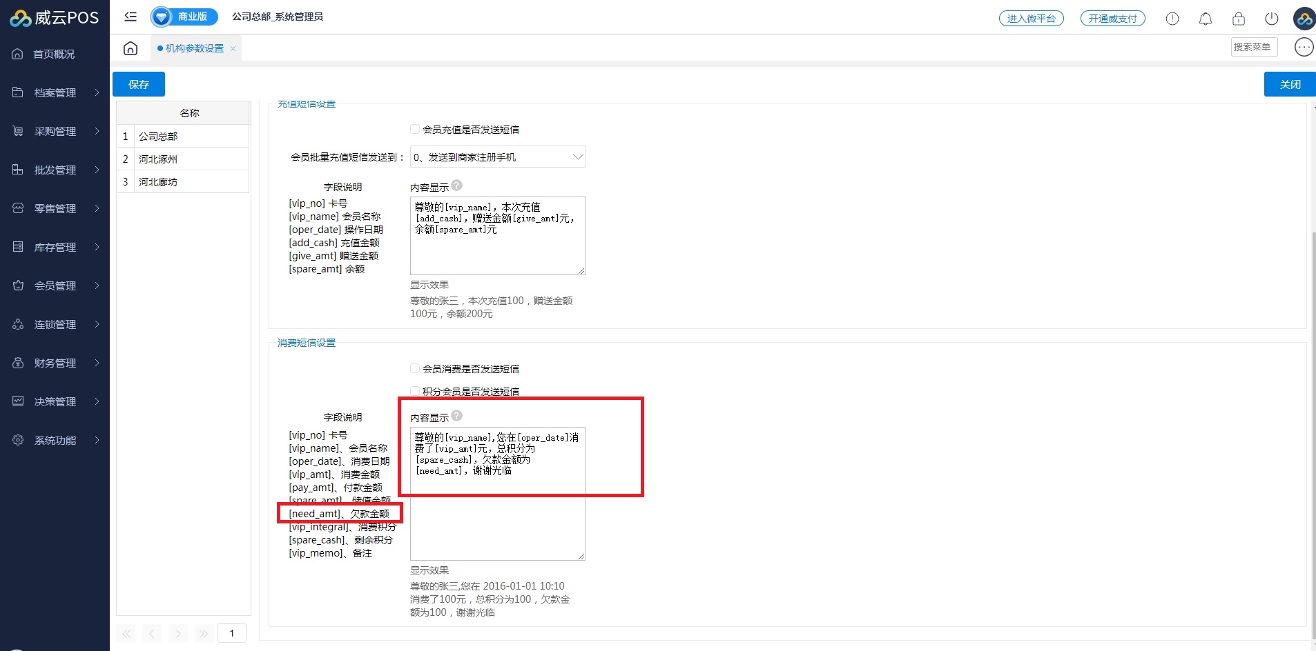 11 威云前臺消費短信增加了會員欠款金額字段的功能