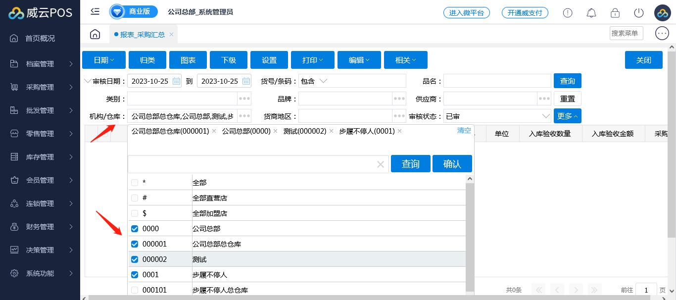 01. 威云后臺采購匯總報表更多選擇條件增加了倉庫多選條件的查詢功能