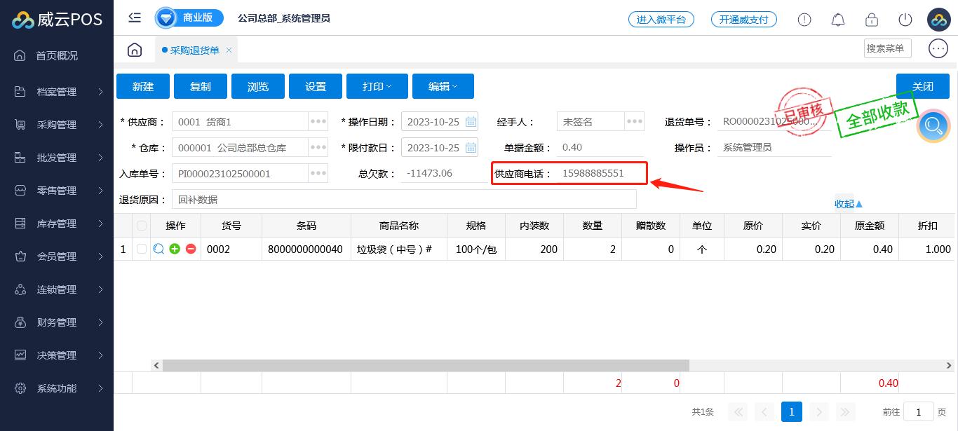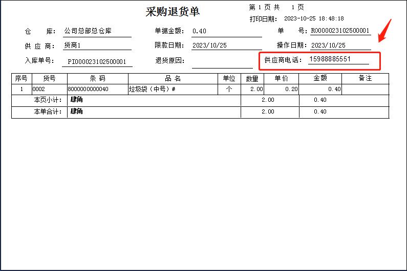 03. 威云后臺采購退貨單增加供應(yīng)商電話字段打印功能