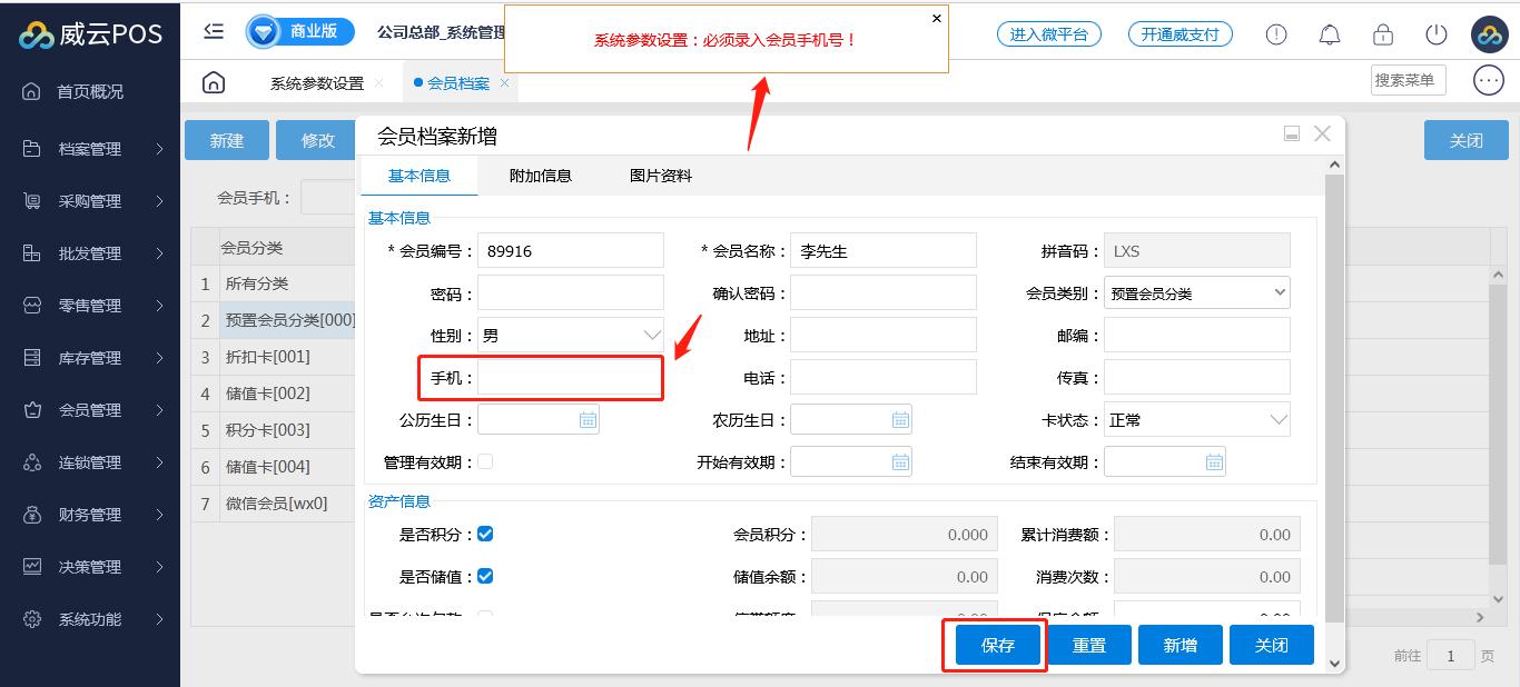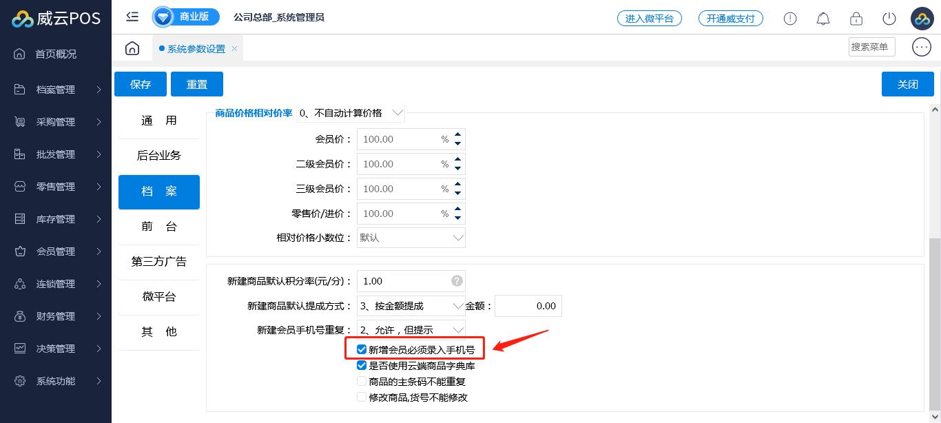 04. 威云后臺系統(tǒng)參數(shù)設(shè)置增加新增會員必須錄入手機號的參數(shù)功能
