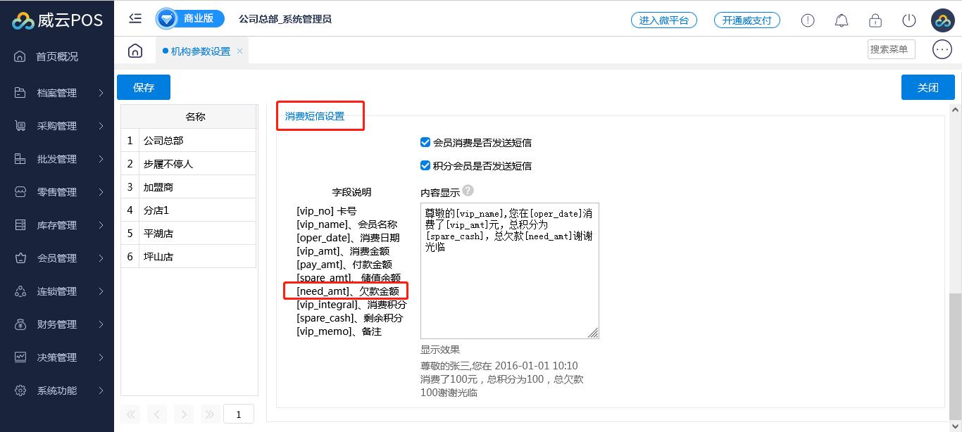 05. 威云后臺消費短信設(shè)置增加會員欠款字段功能