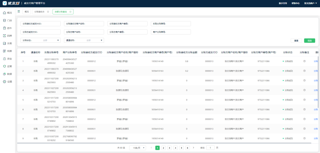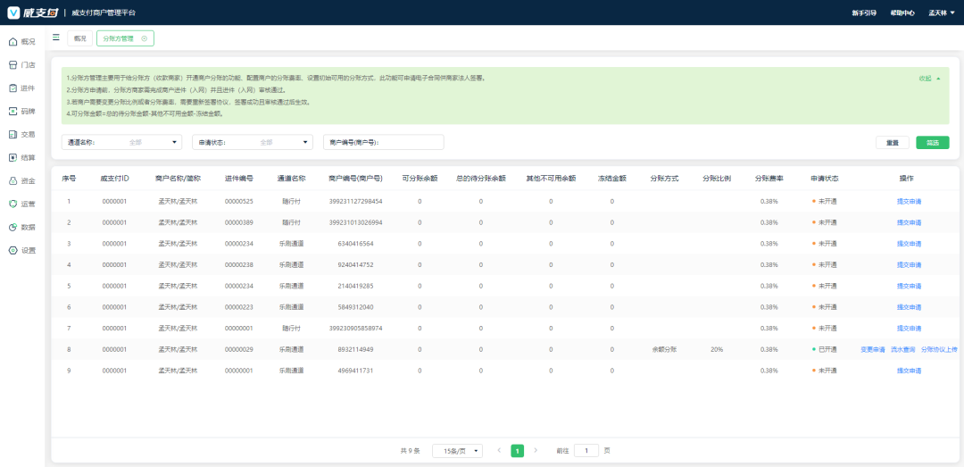 基于收單資金分賬,真實(shí)資金留存在威支付2.0備付金賬戶,商戶的分賬資金記名在威支付的托管賬本,分賬后方可出金,資金安全得到保證,避免資金混用和亂用。