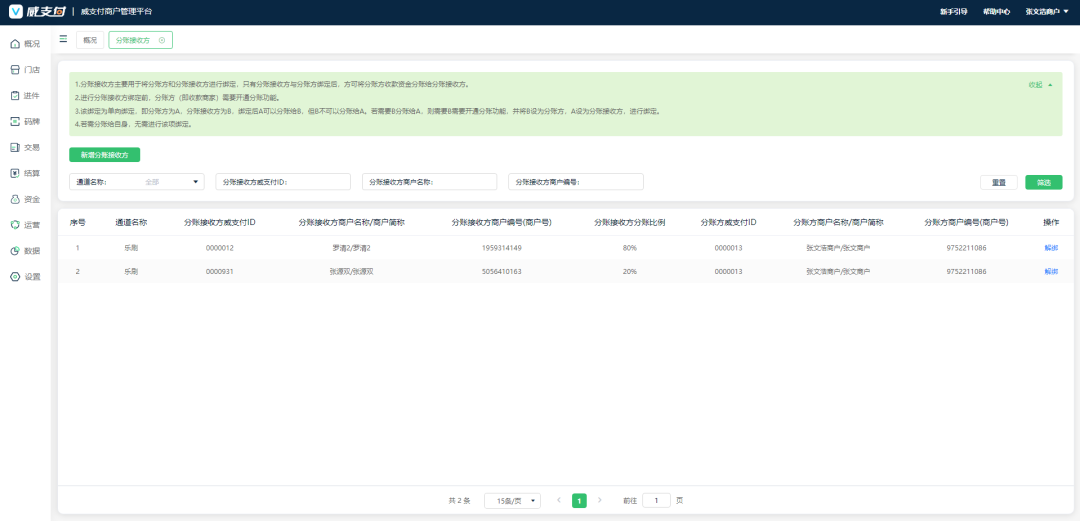 威支付的分賬功能,支持向個(gè)人、供應(yīng)商、平臺(tái)方、服務(wù)商等多方發(fā)起分賬,并且可根據(jù)情況結(jié)算至對(duì)公賬戶和對(duì)私賬戶。