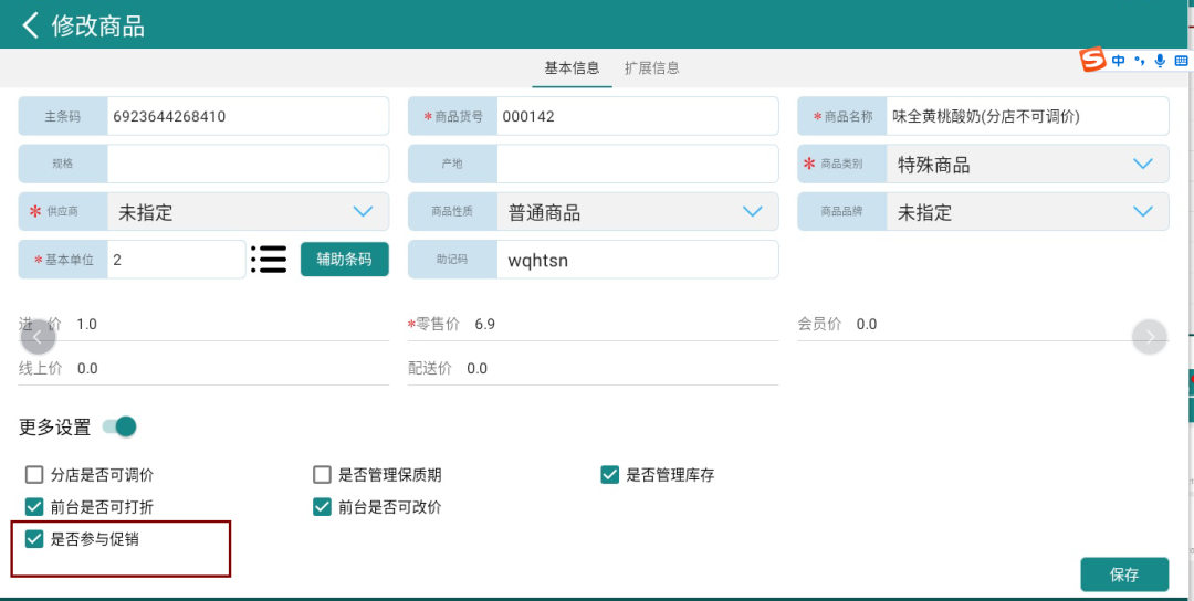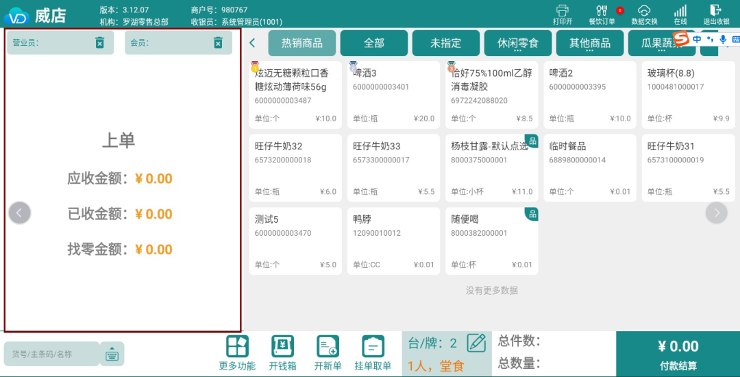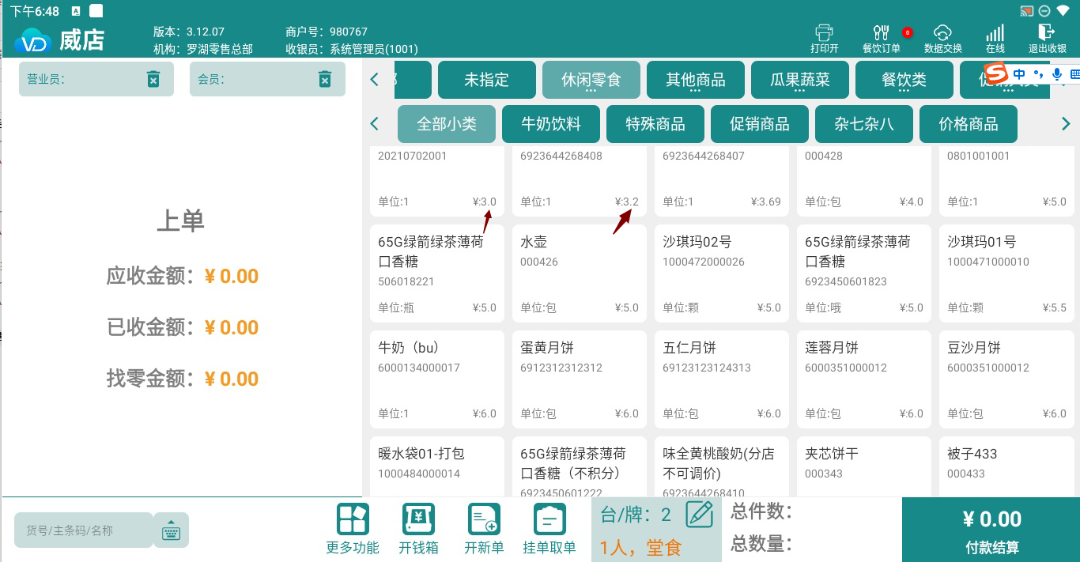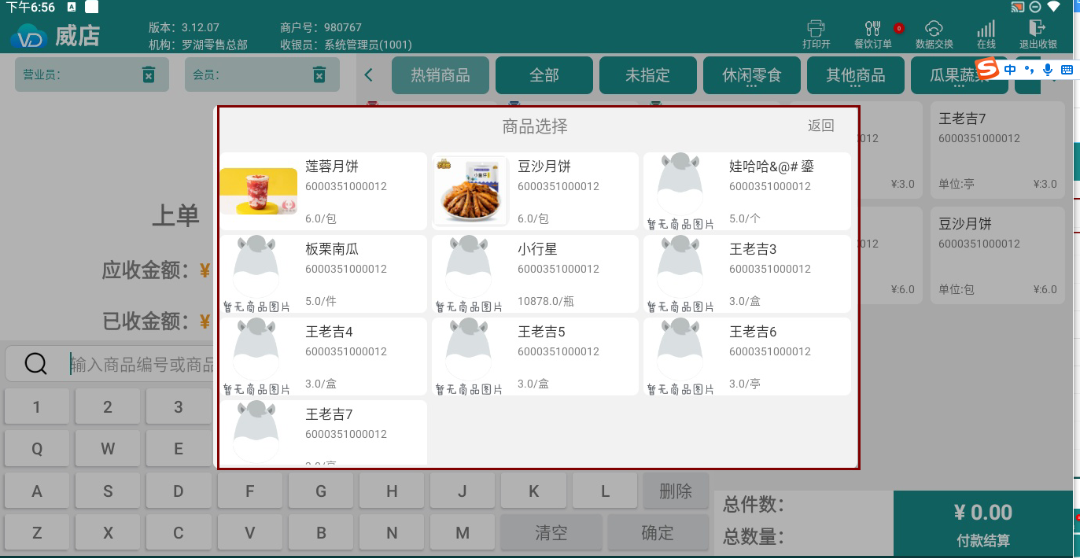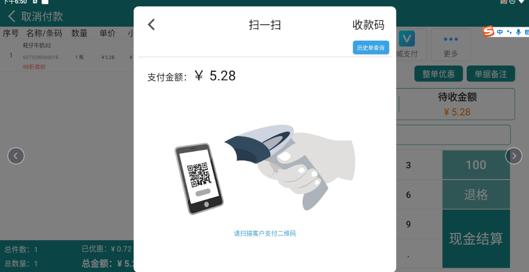 如圖:開啟參數(shù) ,掃描商品檔案不存在的條碼并且云字典庫存在 ,直接新建成功并加入到購物車 ,不會彈出新增商品界面