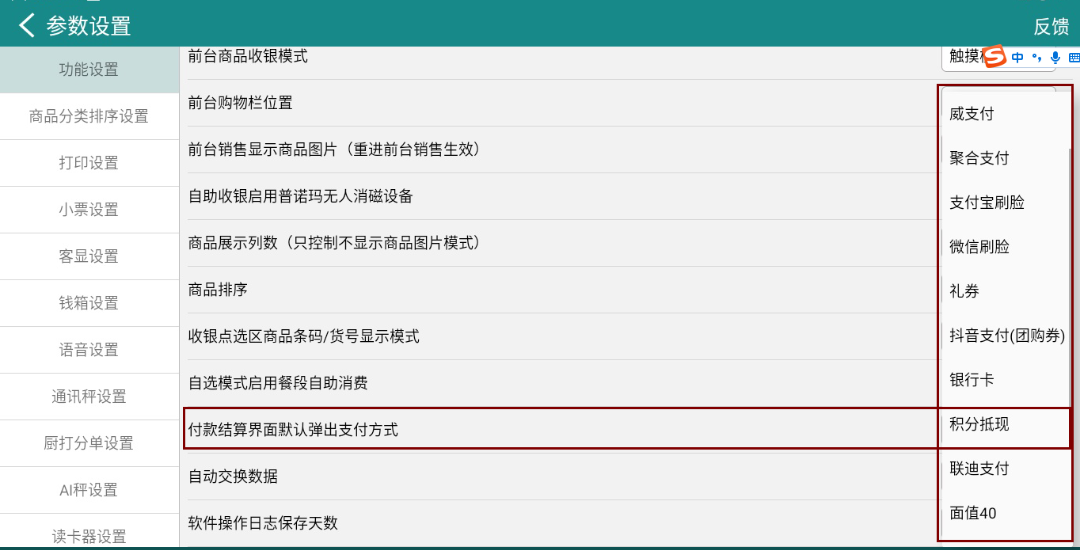 參數(shù)設(shè)置-功能設(shè)置:增加 【付款結(jié)算界面默認彈出支付方式】,支付所有支付方式