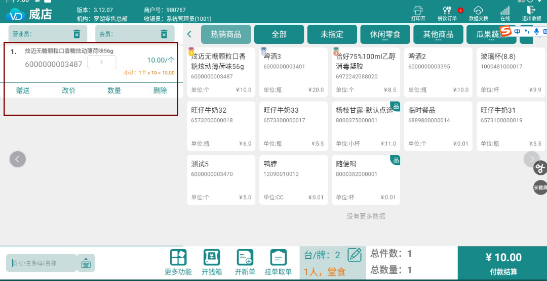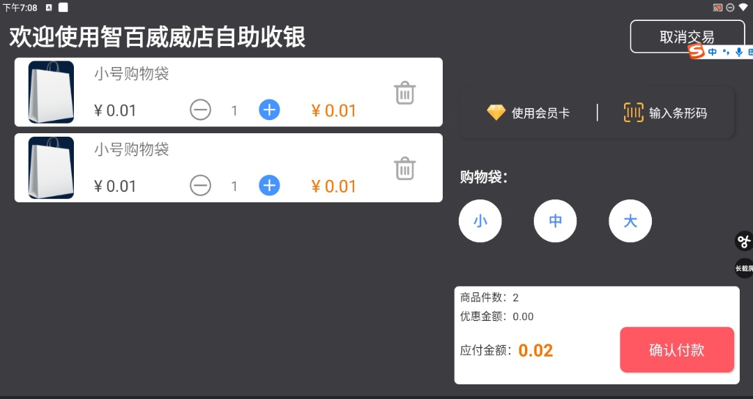 如圖:自助收銀模式,增加刪除商品 ,都會語音播報 “共有X件商品”