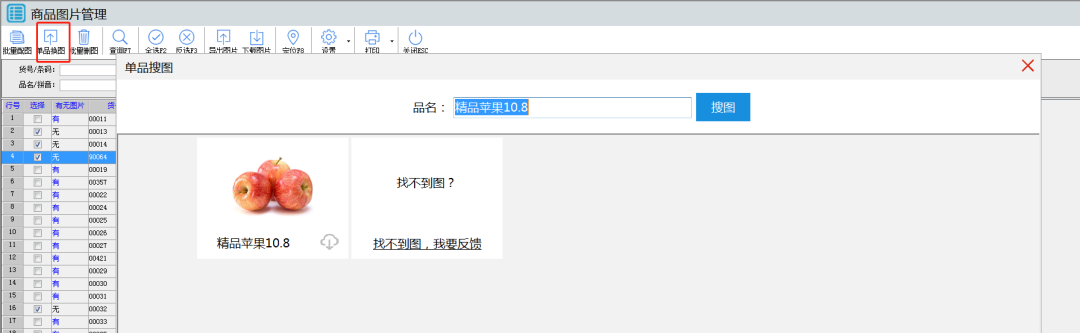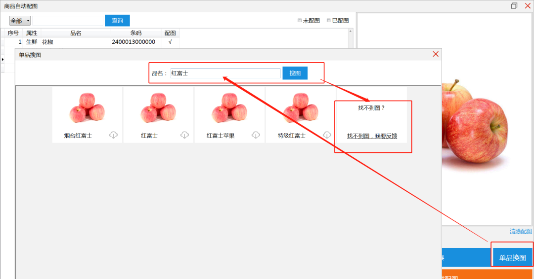 針對(duì)配不上圖片或者有需要更換圖片的商品可以進(jìn)行單品換圖,在換圖窗口精確搜索對(duì)應(yīng)商品名稱進(jìn)行匹配圖片,實(shí)在匹配不上圖片的商品可以進(jìn)行反饋,由智百威工作人員審核后進(jìn)行人工處理