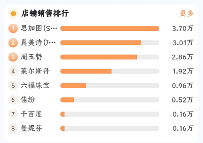 店鋪銷售排行,以排行榜的方式展示門店前八名商品的商品名稱,以及相應(yīng)的銷售額。經(jīng)營者可以分析出哪款商品的銷量更高,占銷售額的比例是多少。