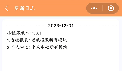 智百威智鼎老板報(bào)表小程序系統(tǒng)每次更新會(huì)自動(dòng)升級,升級后生成“升級日志”,與用戶同步每次升級優(yōu)化、上新了哪些功能。