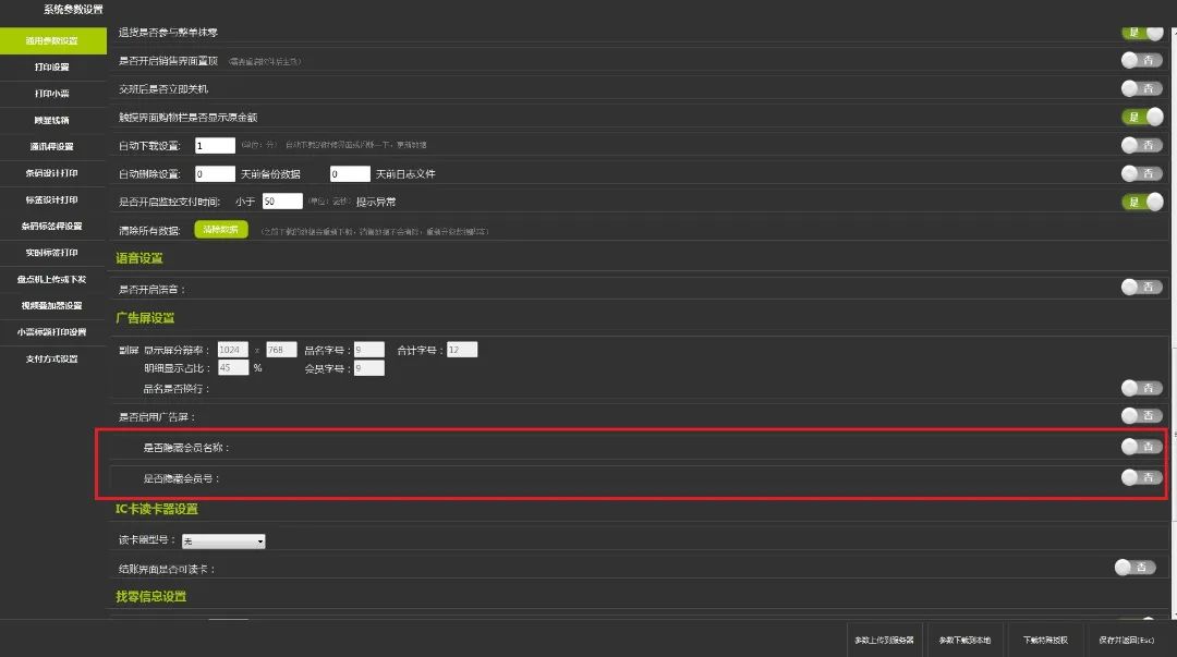 威云pos前臺(tái)系統(tǒng)通用參數(shù)廣告屏設(shè)置增加了是否隱藏會(huì)員名稱、是否隱藏會(huì)員號(hào)的參數(shù)功能。