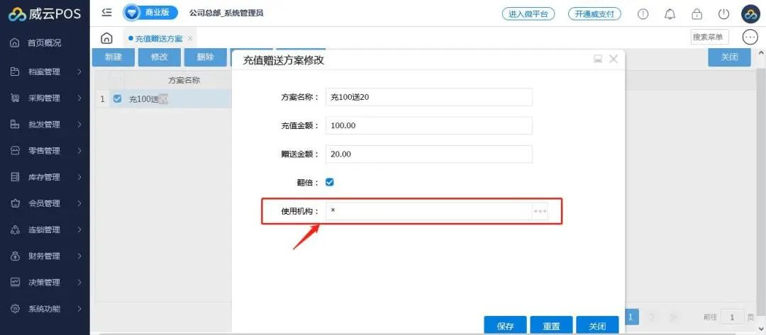 威云pos前臺(tái)會(huì)員儲(chǔ)值增加了充值贈(zèng)送方案使用限制門店的功能