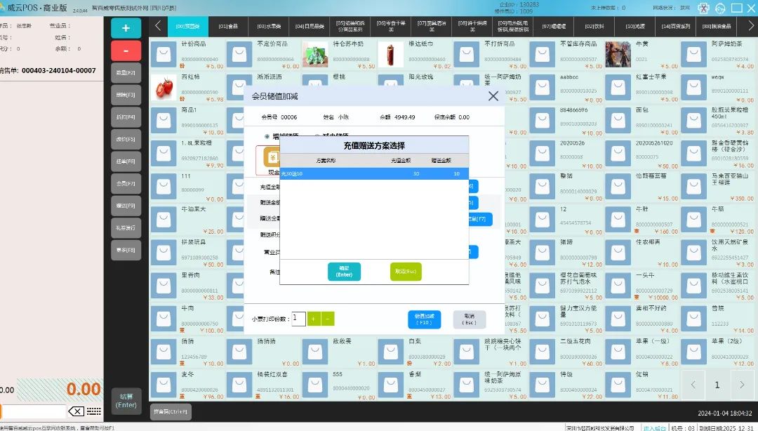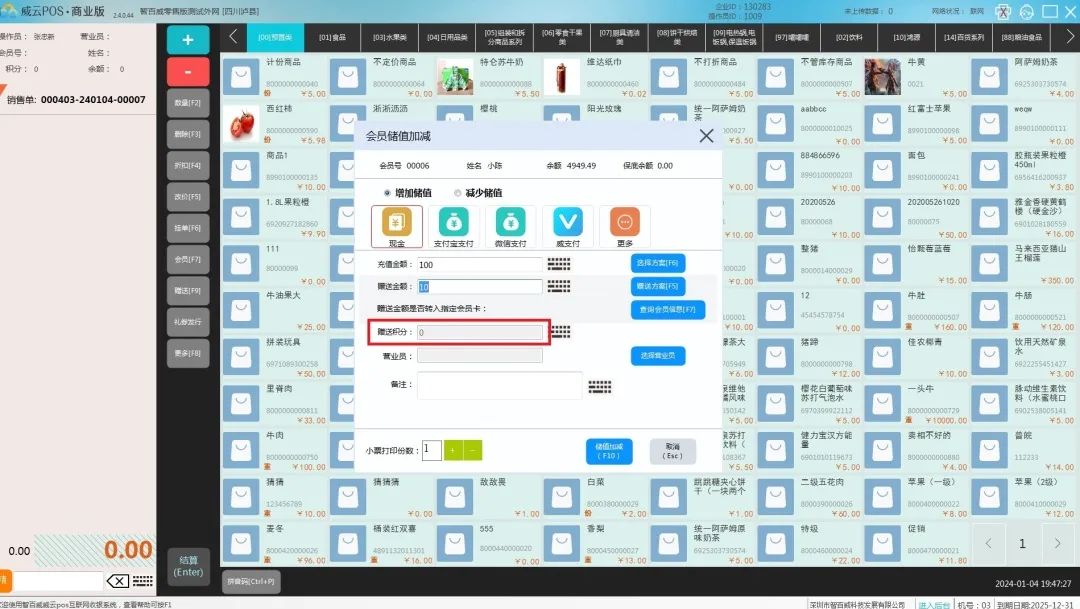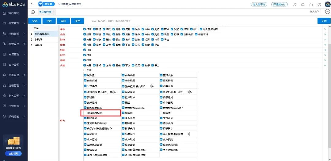 威云POS前臺(tái)會(huì)員儲(chǔ)值增加了贈(zèng)送積分權(quán)限控制的功能