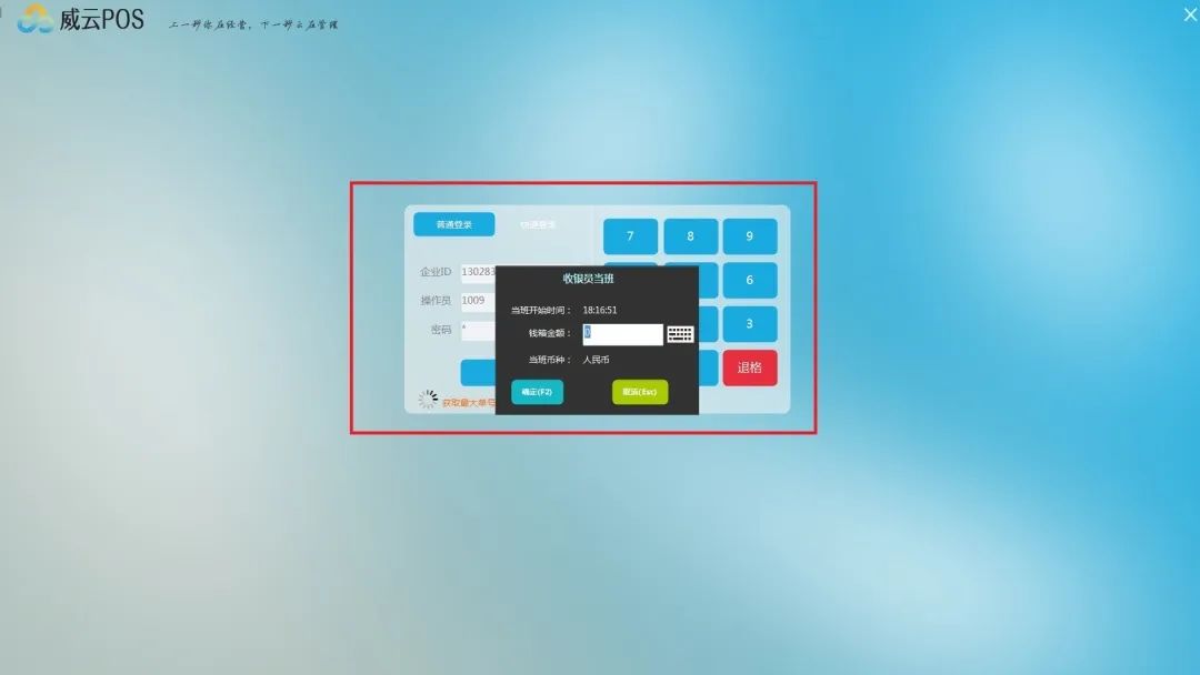 威云pos前臺(tái)登錄增加了自動(dòng)彈出當(dāng)班界面的功能
