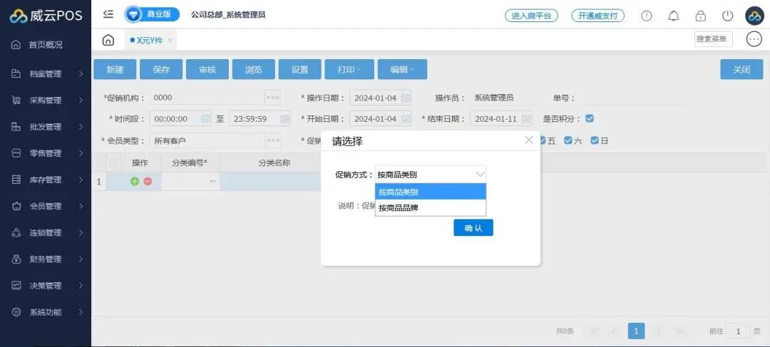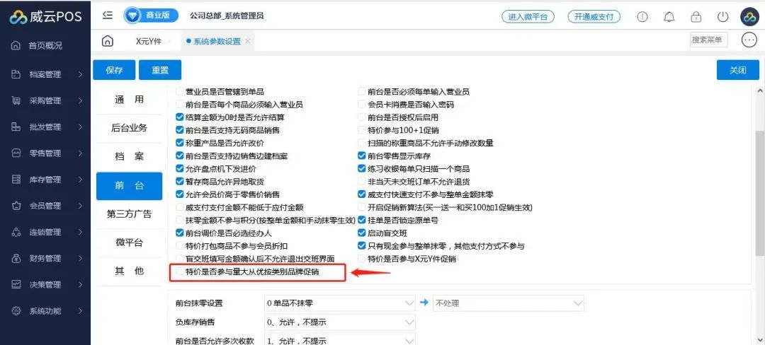 威云pos前臺(tái)增加了量大從優(yōu)_類別品牌促銷以及特價(jià)是否參與參數(shù)的功能