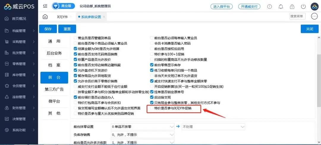 威云pos前臺(tái)增加了x元y件促銷以及特價(jià)是否參與參數(shù)的功能