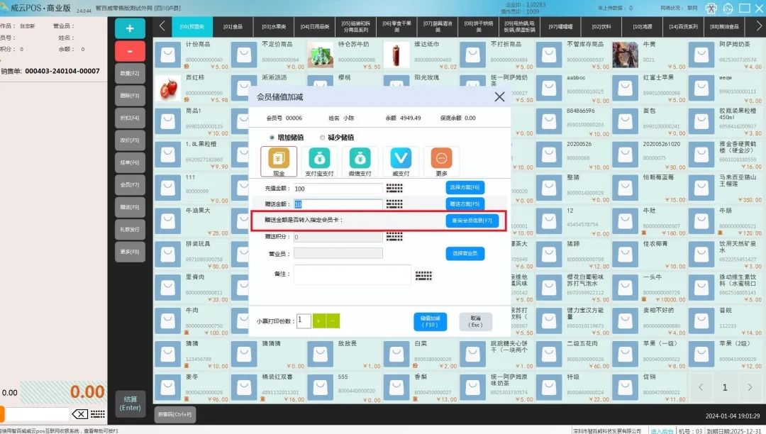 威云pos前臺(tái)增加了會(huì)員充值時(shí)將贈(zèng)送金額轉(zhuǎn)入指定會(huì)員卡的功能