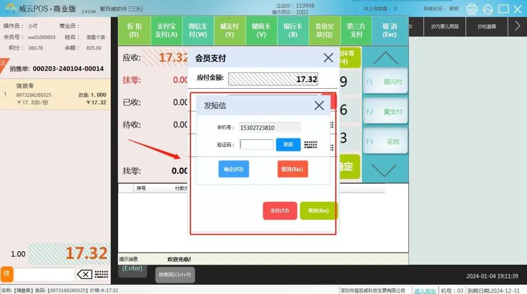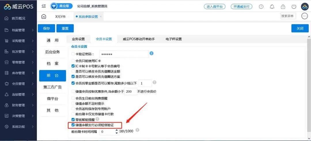 威云pos前臺(tái)會(huì)員儲(chǔ)值消費(fèi)增加了必須短信驗(yàn)證的功能