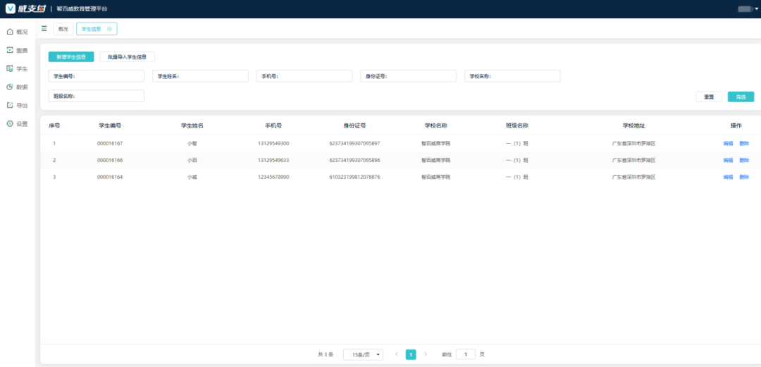 1) 學(xué)生管理“學(xué)生管理”功能幫助教培機(jī)構(gòu)管理學(xué)生姓名、聯(lián)系方式、身份證號、班級等基本信息。