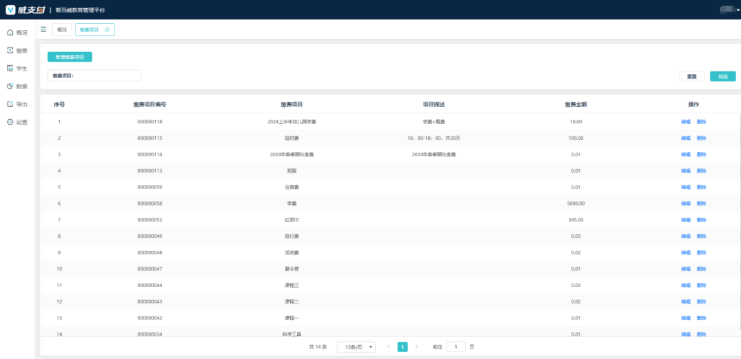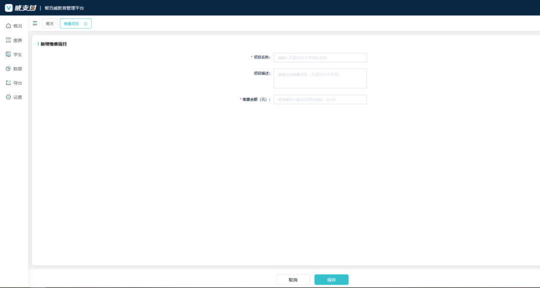 “繳費項目”支持教培機(jī)構(gòu)創(chuàng)建繳費項目相關(guān)信息,如項目名稱、金額、項目描述等。