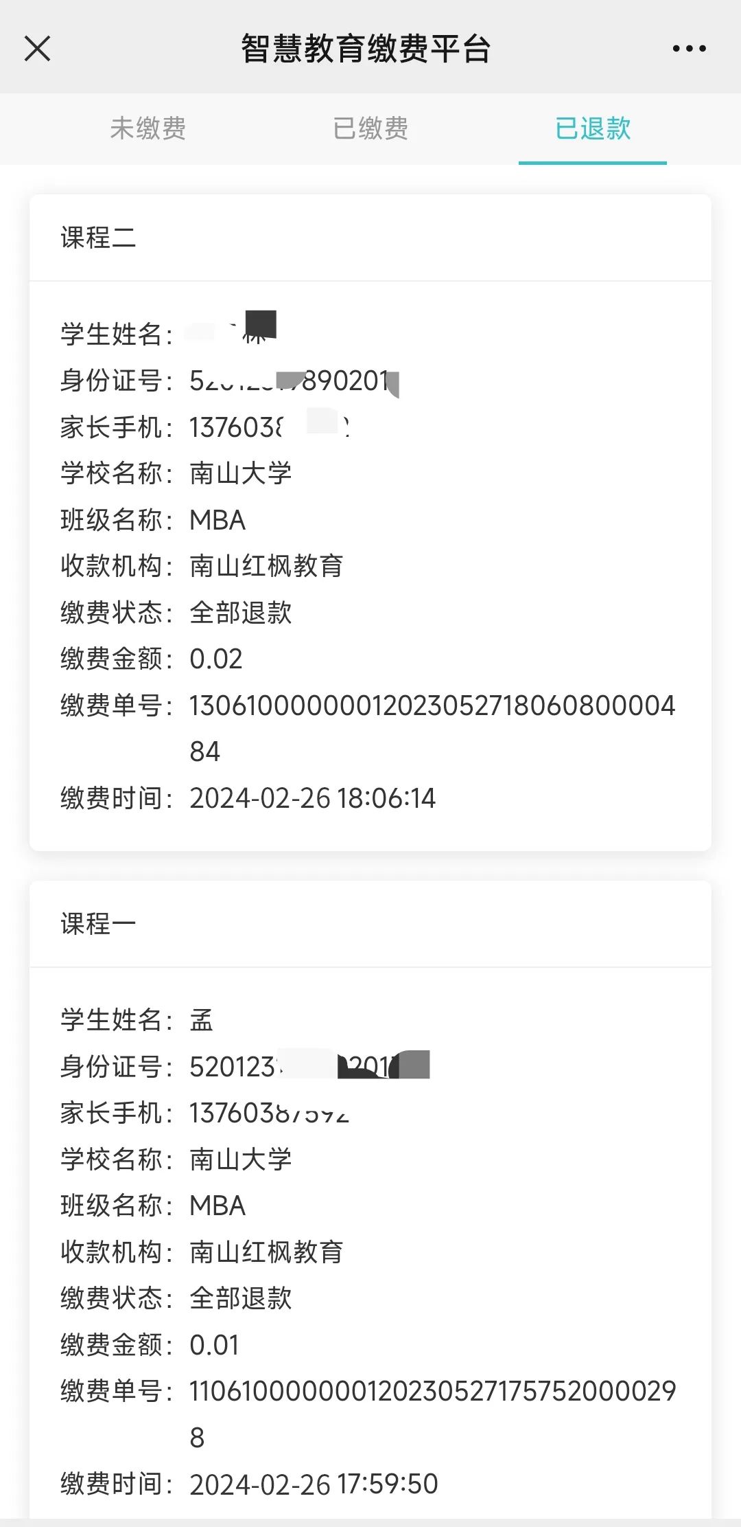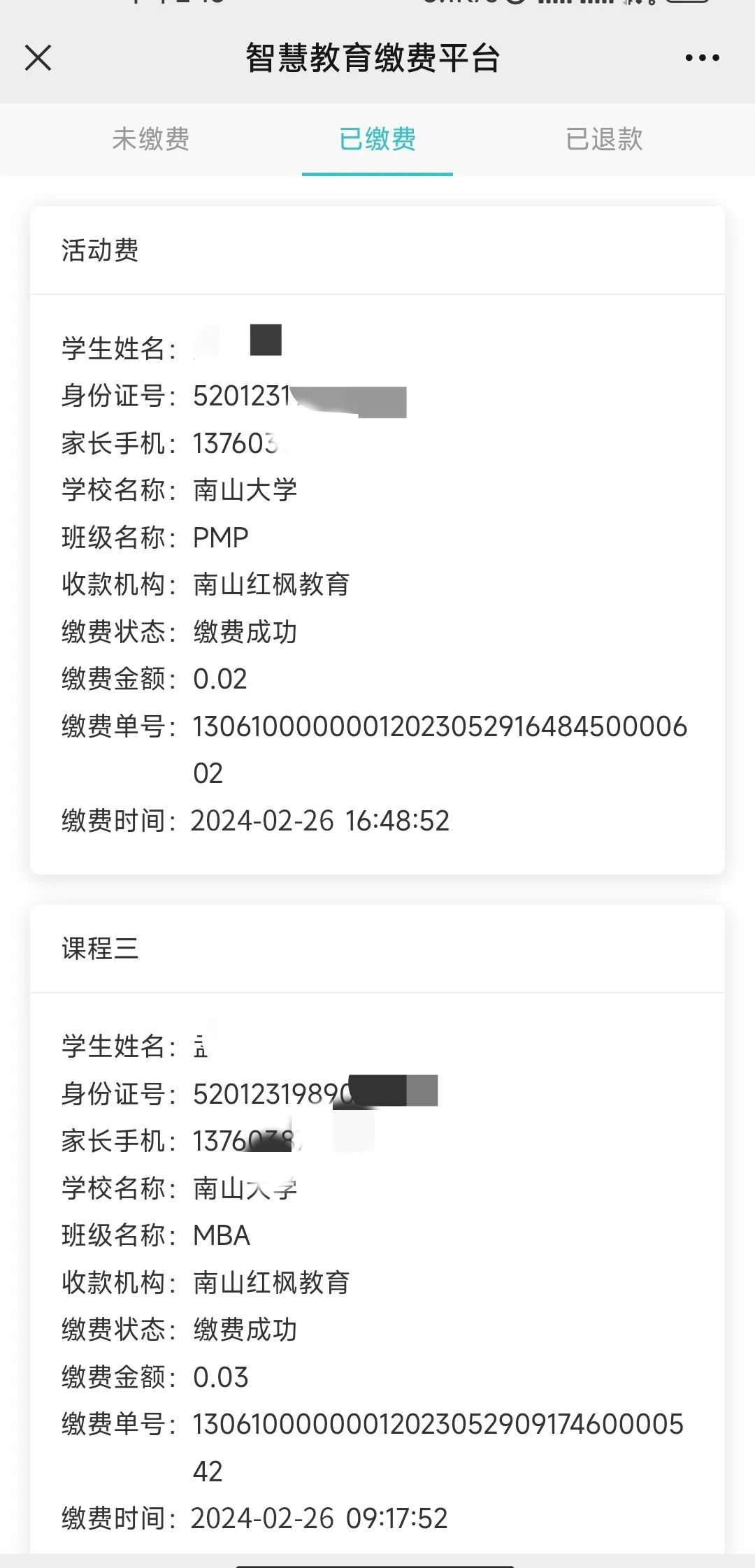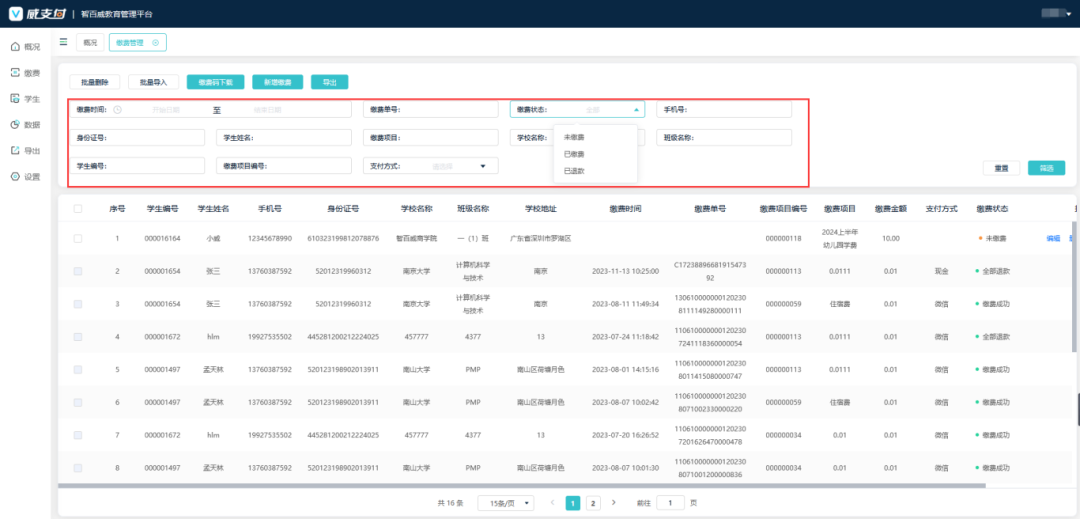 “繳費管理”主要做查詢用,支持按繳費時間、繳費單號、繳費狀態(tài)(未繳費/已繳費/已退款)、手機(jī)號、身份證號、學(xué)生姓名、項目、班級等條件篩選查詢。