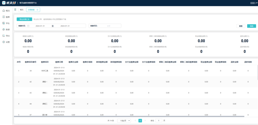 “交易數(shù)據(jù)”里實時看到繳費總額、繳費總筆數(shù)、退款金額、退款筆以及微信、支付寶、銀聯(lián)的收款對比數(shù)據(jù)。