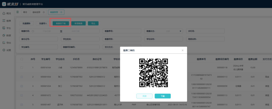 在系統(tǒng)后臺繳費--繳費下載--繳費碼下載,可以下載付款二維碼給家長繳費。