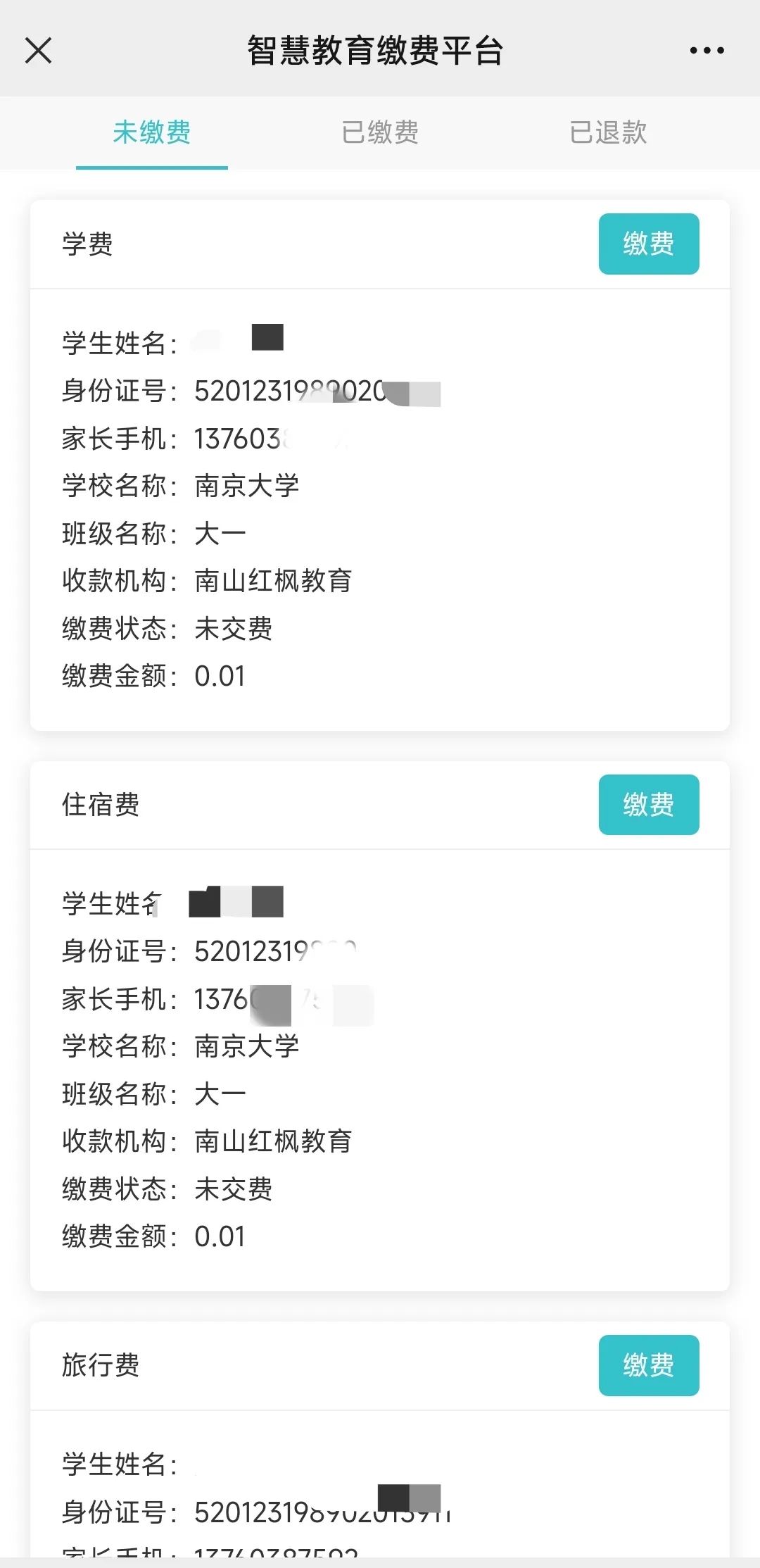 家長在手機(jī)端可直接查詢未繳費項目、已繳費項目、已退款項目,如遇有未續(xù)費的項目,可根據(jù)所需項目進(jìn)行逐一繳費,付款方式支持微信、支付寶、銀聯(lián)。