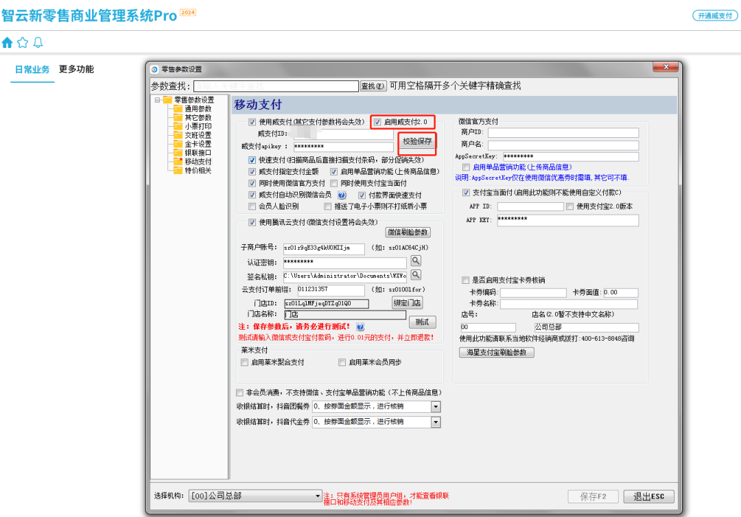后臺(tái)增加威支付2.0的配置使用,并新增威支付1.0校驗(yàn)保存設(shè)置。