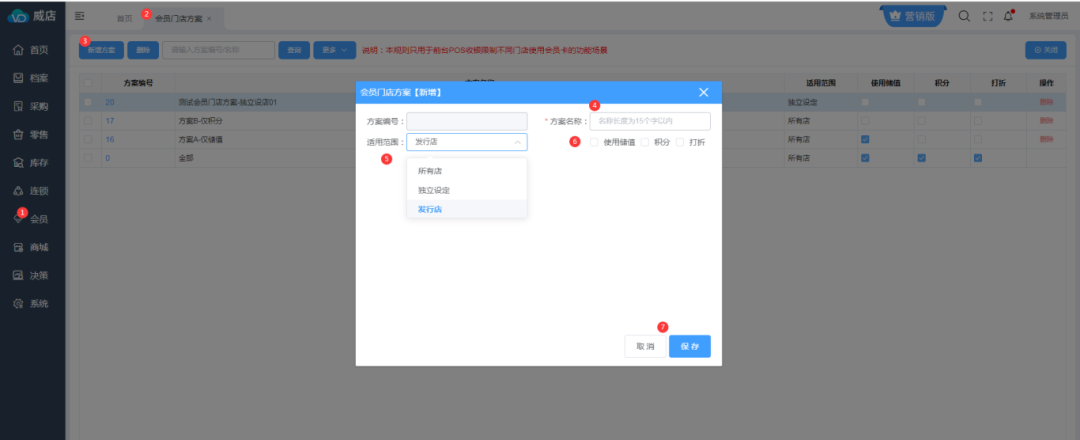 會員-會員門店方案:新增方案,選擇適用范圍,勾選權(quán)限,保存。