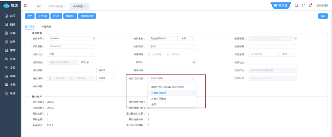 會員檔案選擇會員門店方案,保存。