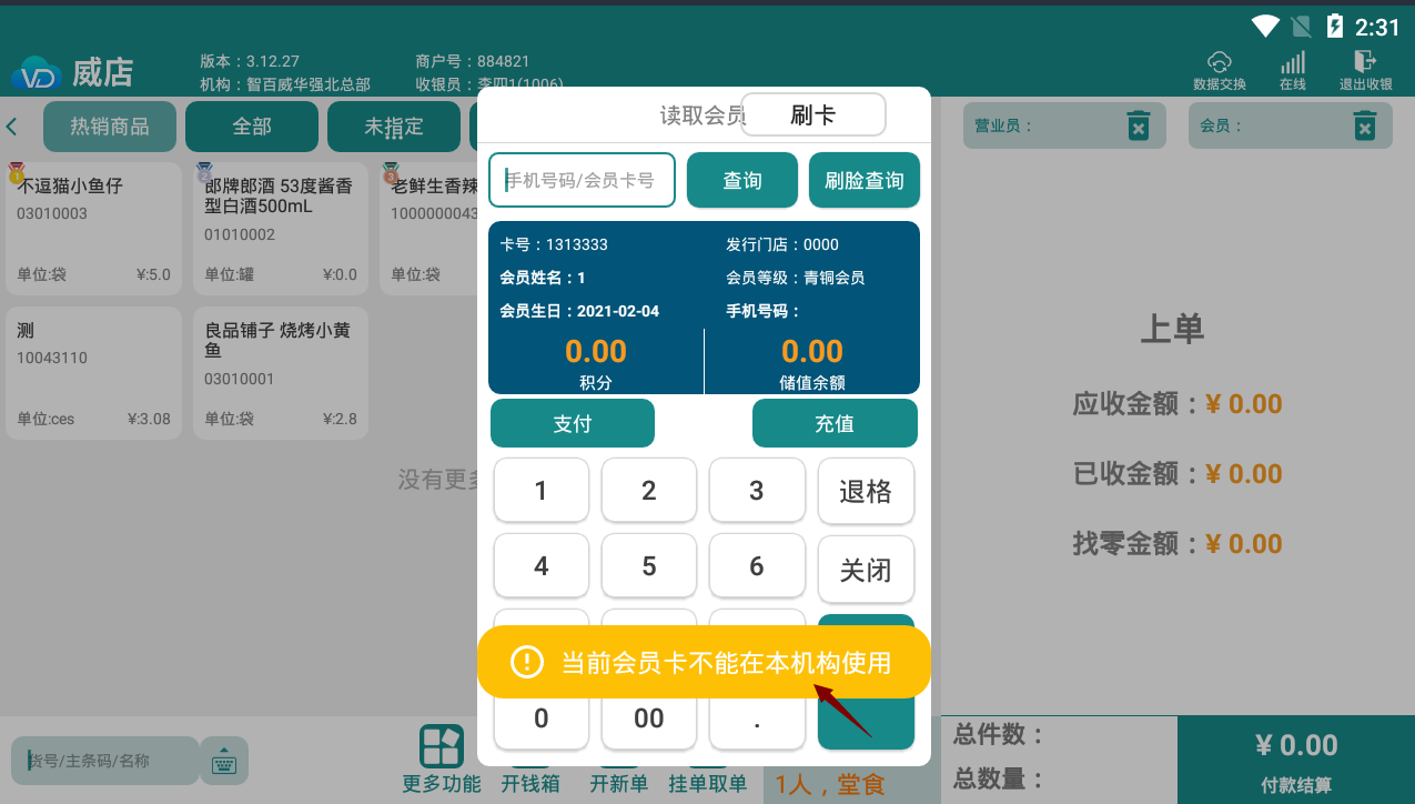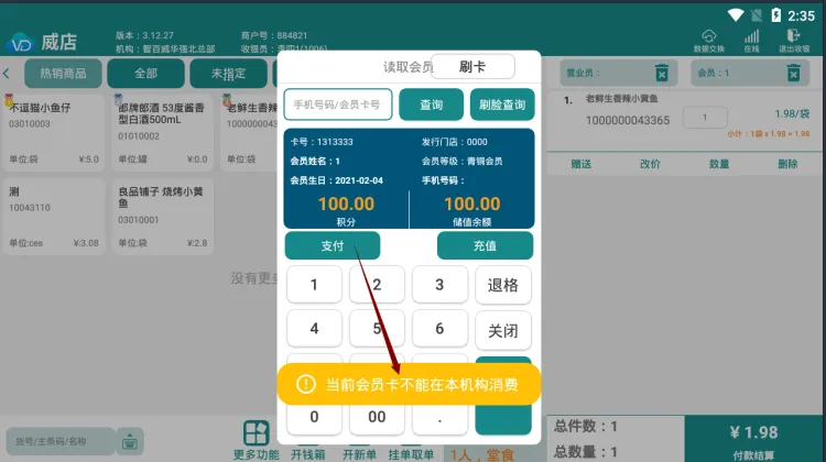 前臺儲值卡支付 則會提示”當(dāng)前會員卡不能在本機(jī)構(gòu)消費”
