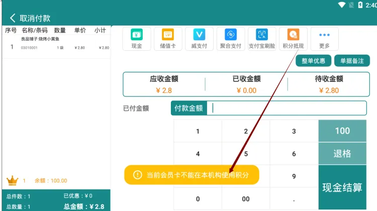 前臺積分抵現(xiàn)支付 則會提示”當(dāng)前會員卡不能在本機(jī)構(gòu)使用積分”