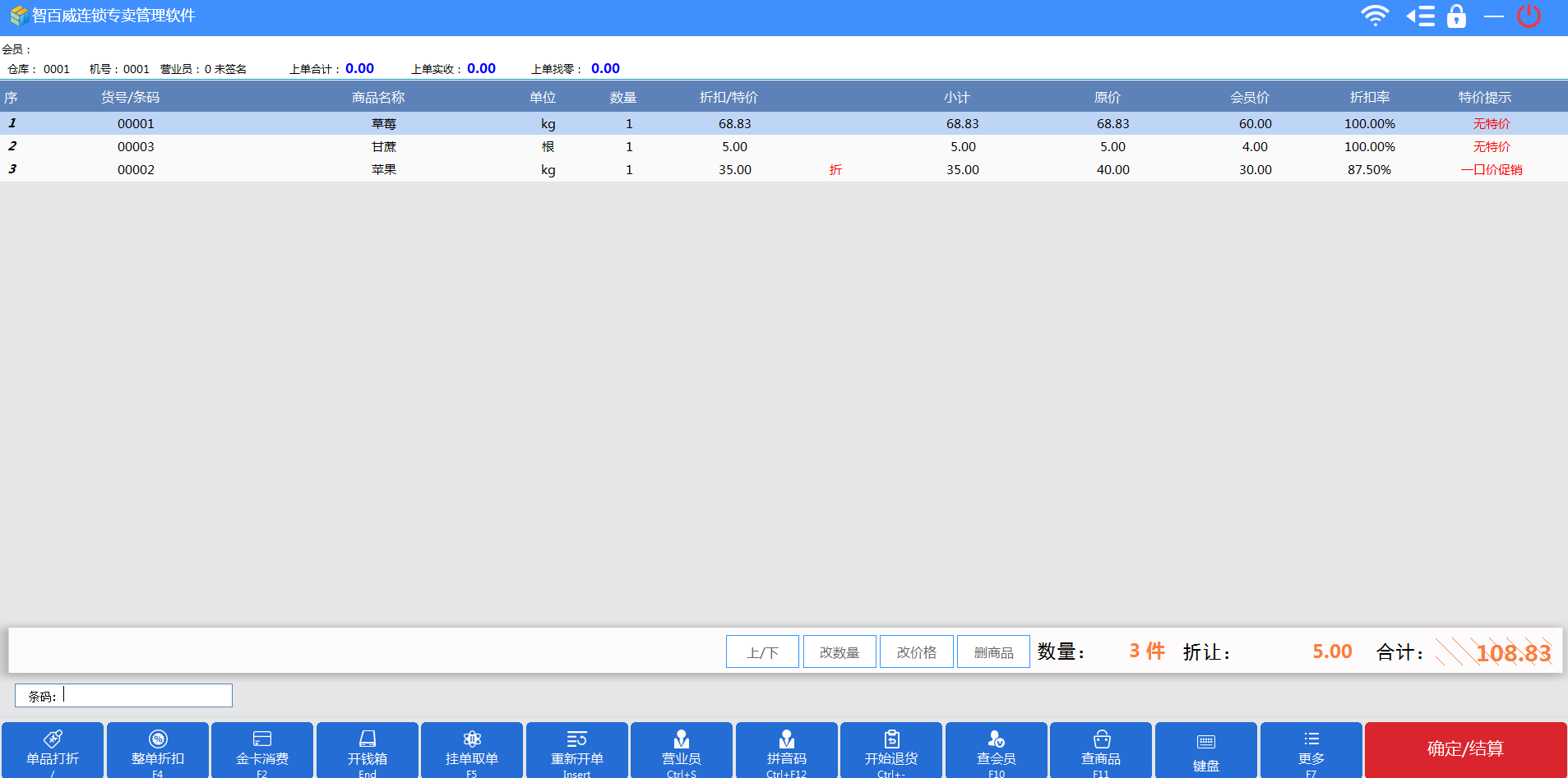 草莓零售價為68.83元、蘋果零售價為40.00元、甘蔗零售價為5.00元;