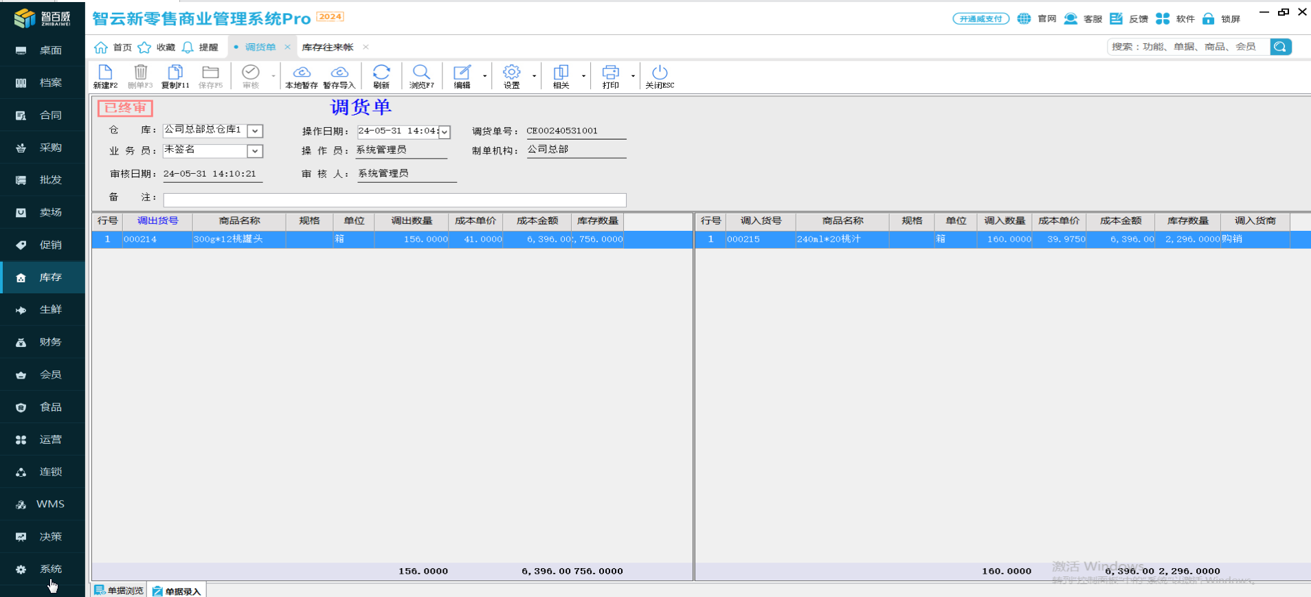 注:單據(jù)保存未審核時,調(diào)出商品有再做其它的入庫業(yè)務(wù)且變更了成本單價、金額,審核調(diào)貨單后會反更新該商品這筆調(diào)出業(yè)務(wù)的的成本單價、金額。調(diào)入商品的這筆調(diào)貨業(yè)務(wù)成本金額、單價也會等于調(diào)出商品的成本金額