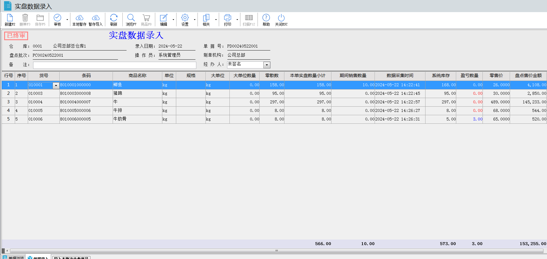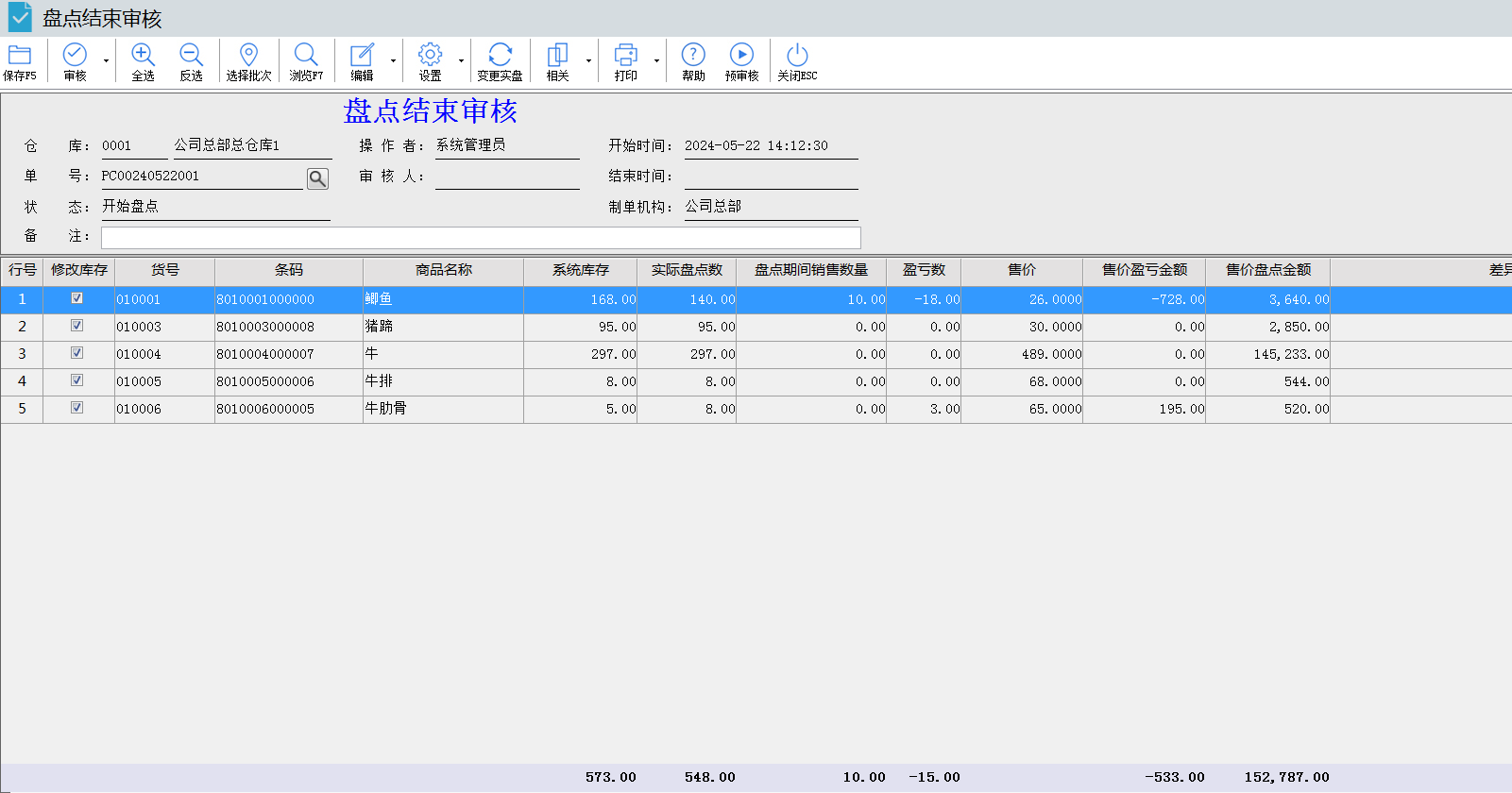 盤點結(jié)束審核在開啟動態(tài)盤點參數(shù)后,會增加期間銷售數(shù)量列,并且會帶入原實盤數(shù)據(jù)錄入單中的期間銷售數(shù)量