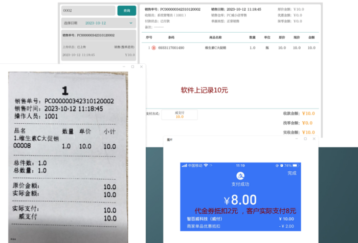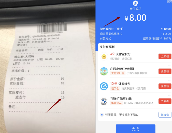 威支付結(jié)算:注意:商品共10元,優(yōu)惠了2元,手機(jī)扣款8元 ,單品優(yōu)惠金額不會(huì)在威店軟件上體現(xiàn),軟件上記錄10元