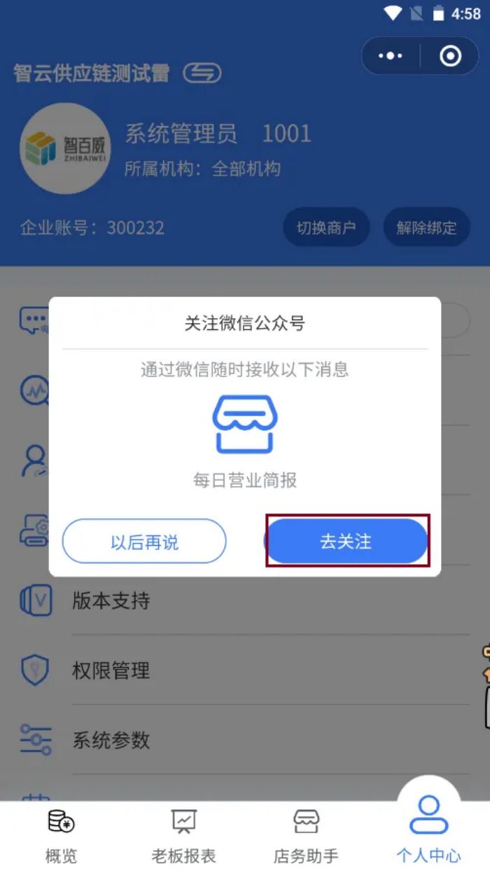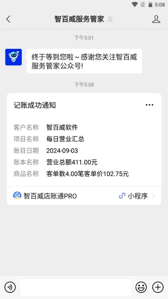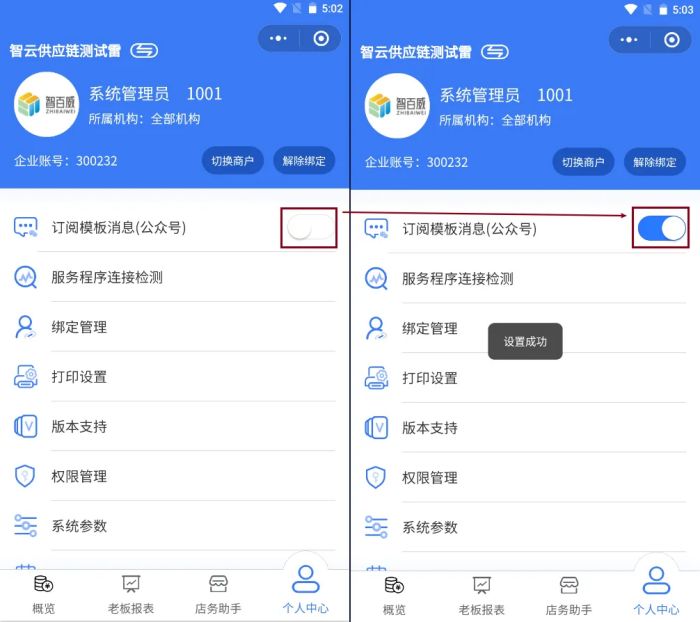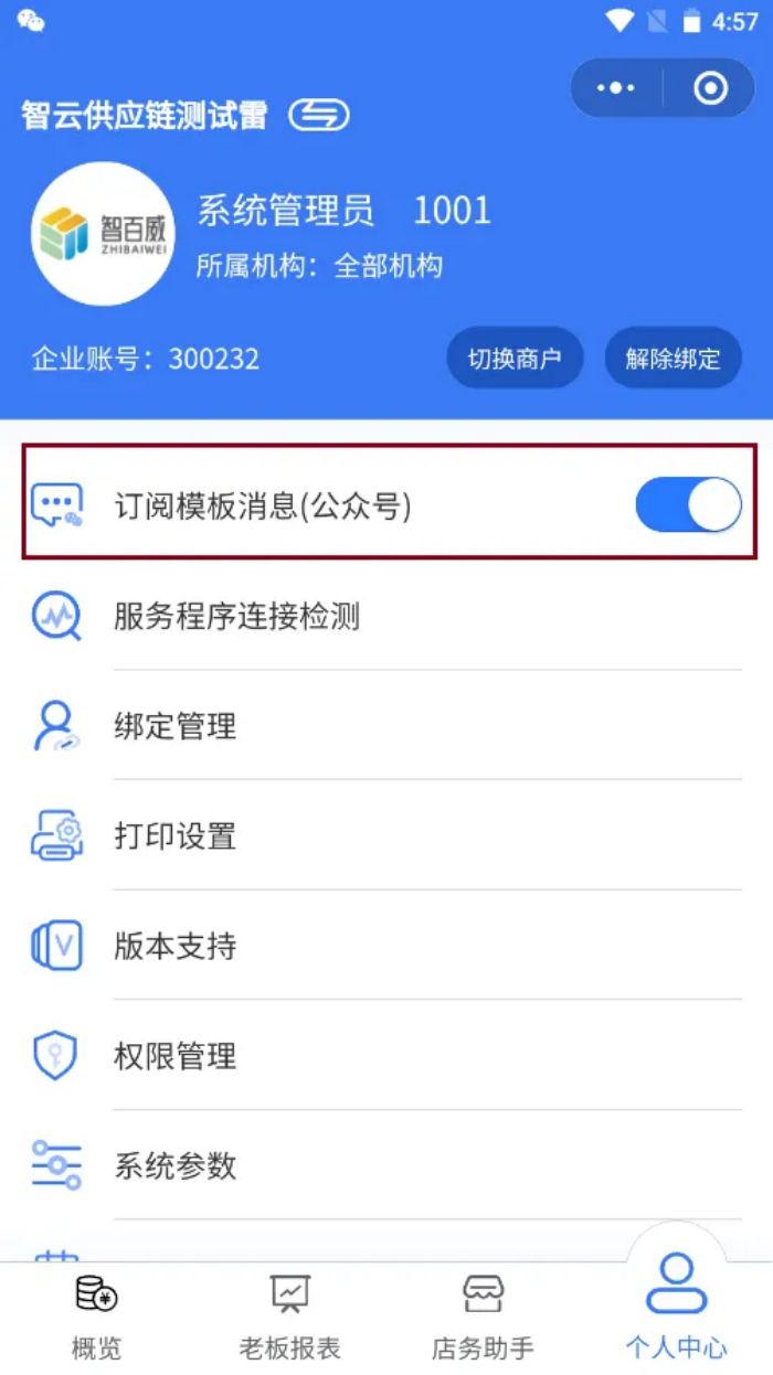 1)打開(kāi)“智百威店賬通PRO”小程序,開(kāi)啟“訂閱模板消息(公眾號(hào))”按鈕