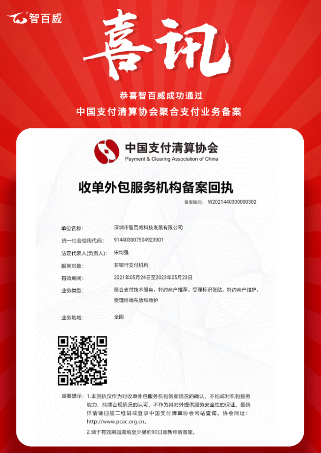 恭喜智百威成功通過中國支付清算協(xié)會聚合支付業(yè)務(wù)備案!其中聚合支付服務(wù)、特約商戶推薦、受理標(biāo)識張貼、特約商戶維護、受理終端布放和維護五項業(yè)務(wù)類型全通過,這標(biāo)志著智百威威支付符合市場監(jiān)督相關(guān)規(guī)定,能更好的保障主體參與者和消費者的權(quán)益。安全規(guī)范的智百威威支付,用戶用的更放心。