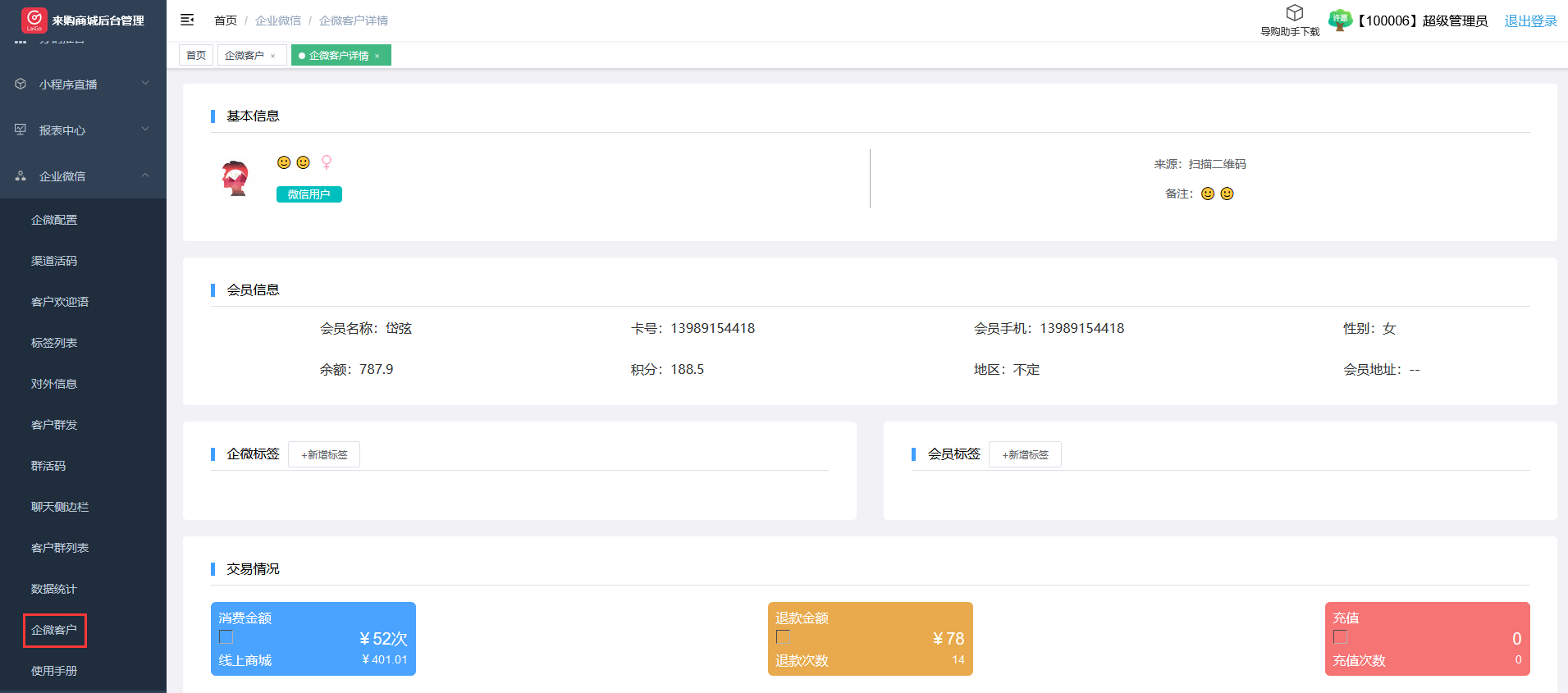 客戶的基本信息、消息情況、退款情況、充值情況以及此客戶的企微標簽都可以在這里統(tǒng)計到,清晰了然。