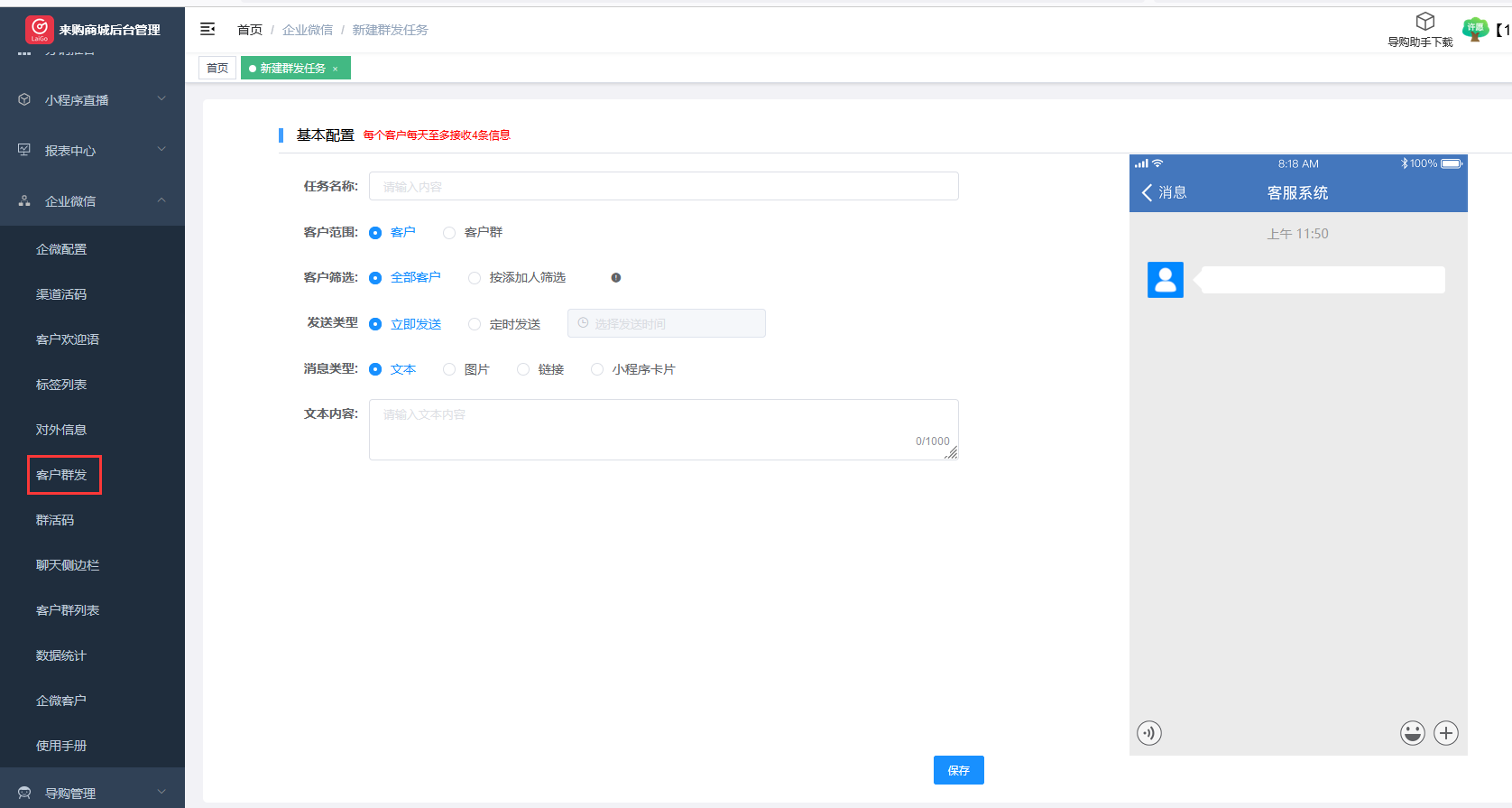 可指定客戶范圍,客戶群,以及自定義內容,支持一鍵定時群發(fā)消息,高效便捷,又能保持與客戶的連接和群的活躍度。