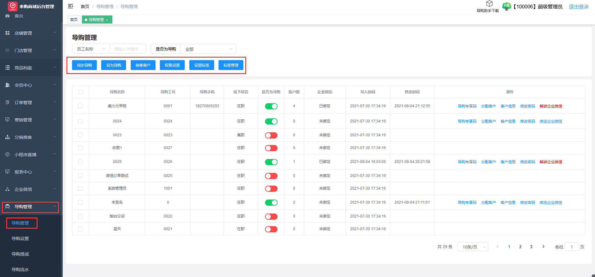 可以為導購設置標簽、專享碼、設置權限,轉移導購名下的客戶,查詢導購名下的客戶等。