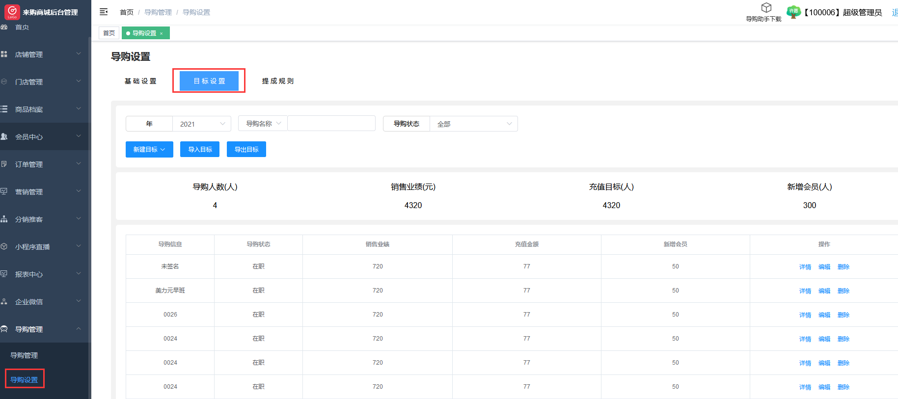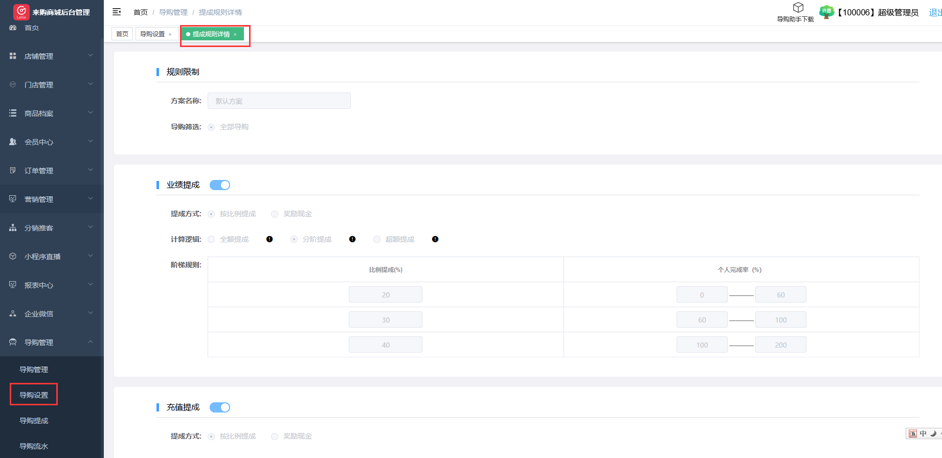 可以為導購綁定場景,如會員注冊、會員下單、會員領券。為導購設置銷售業(yè)績、充值人數、新增會員人數目標,設定提成方案。
