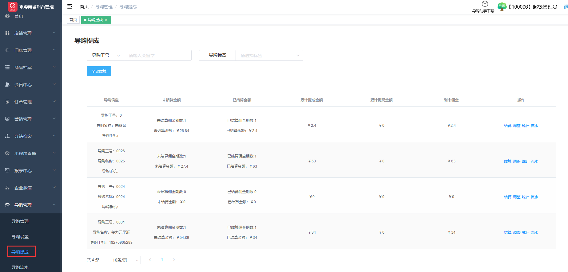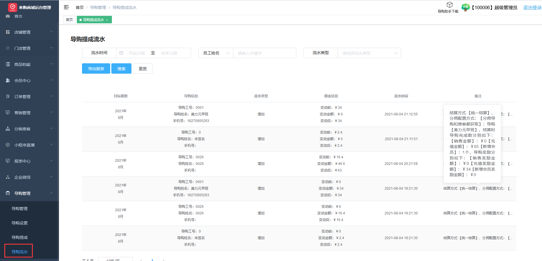 導購已結算傭金和未結算傭金以及總結算傭金流水,都可以在“導購提成”“導購流水”里詳細查詢到。