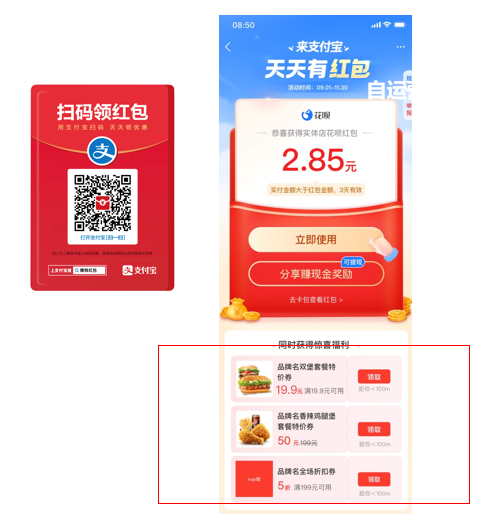 商家賺錢紅包碼,消費(fèi)者掃碼領(lǐng)取紅包,同時(shí)會(huì)展示商家單品券活動(dòng)內(nèi)容,領(lǐng)券即可將消費(fèi)者引流到店。