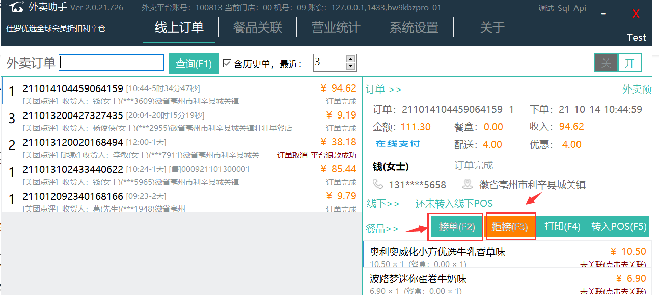 顧客在外賣平臺(tái)上點(diǎn)了訂單后,門店會(huì)接到”你有新訂單“語(yǔ)音提醒,智百威系統(tǒng)前臺(tái)在”線上訂單“功能界面可直接做接單/拒絕/打印/轉(zhuǎn)入POS系統(tǒng)等操作。