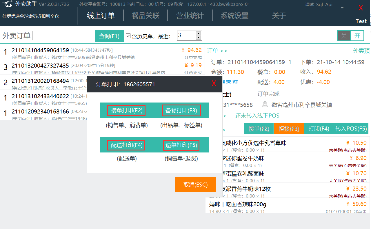 接單打印/備餐打印/配送打印/退單打印 ▼
