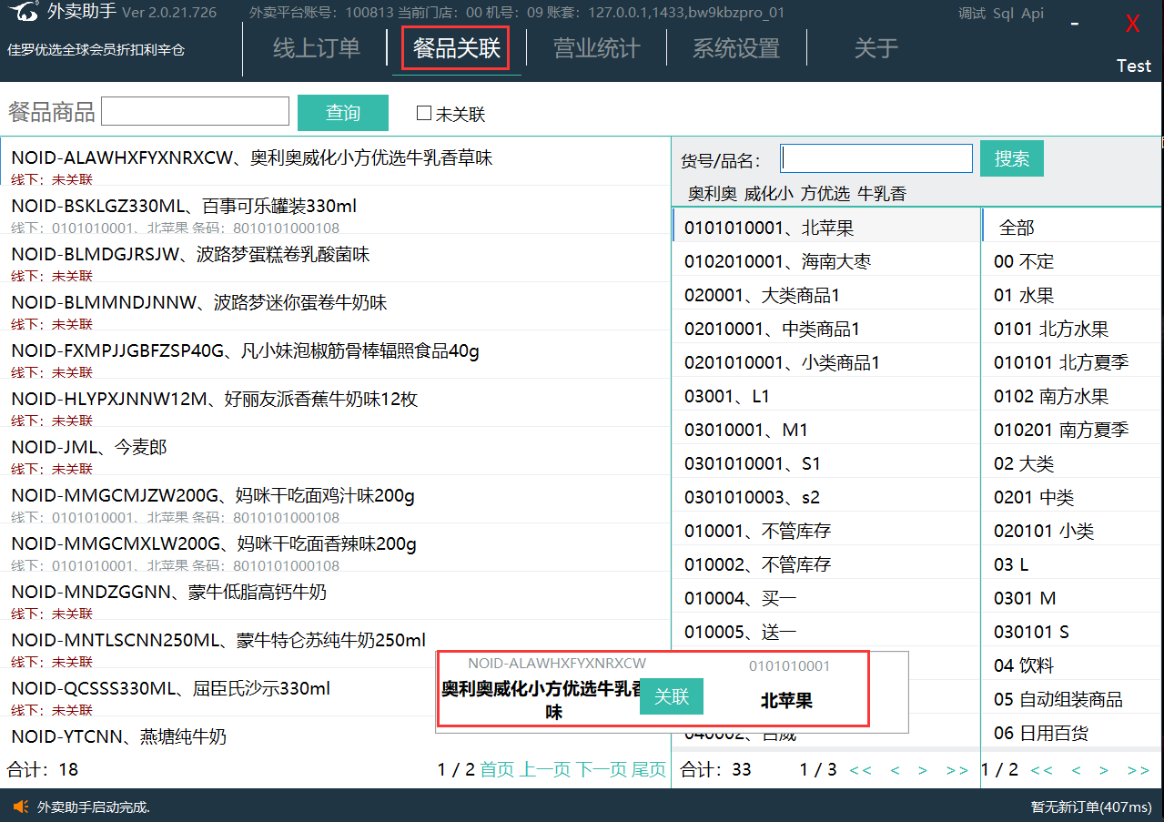 外賣線上平臺(tái)與線下門店的菜品名字有些取的不一樣,剛上線外賣平臺(tái)的時(shí)候可以互相關(guān)聯(lián)線上線下菜品,這樣當(dāng)外賣訂單來(lái)了,就能自動(dòng)與線下相關(guān)菜品進(jìn)行匹配,實(shí)現(xiàn)統(tǒng)一管理線上線下進(jìn)銷存。第一次關(guān)聯(lián)后,后續(xù)不用再做關(guān)聯(lián)。