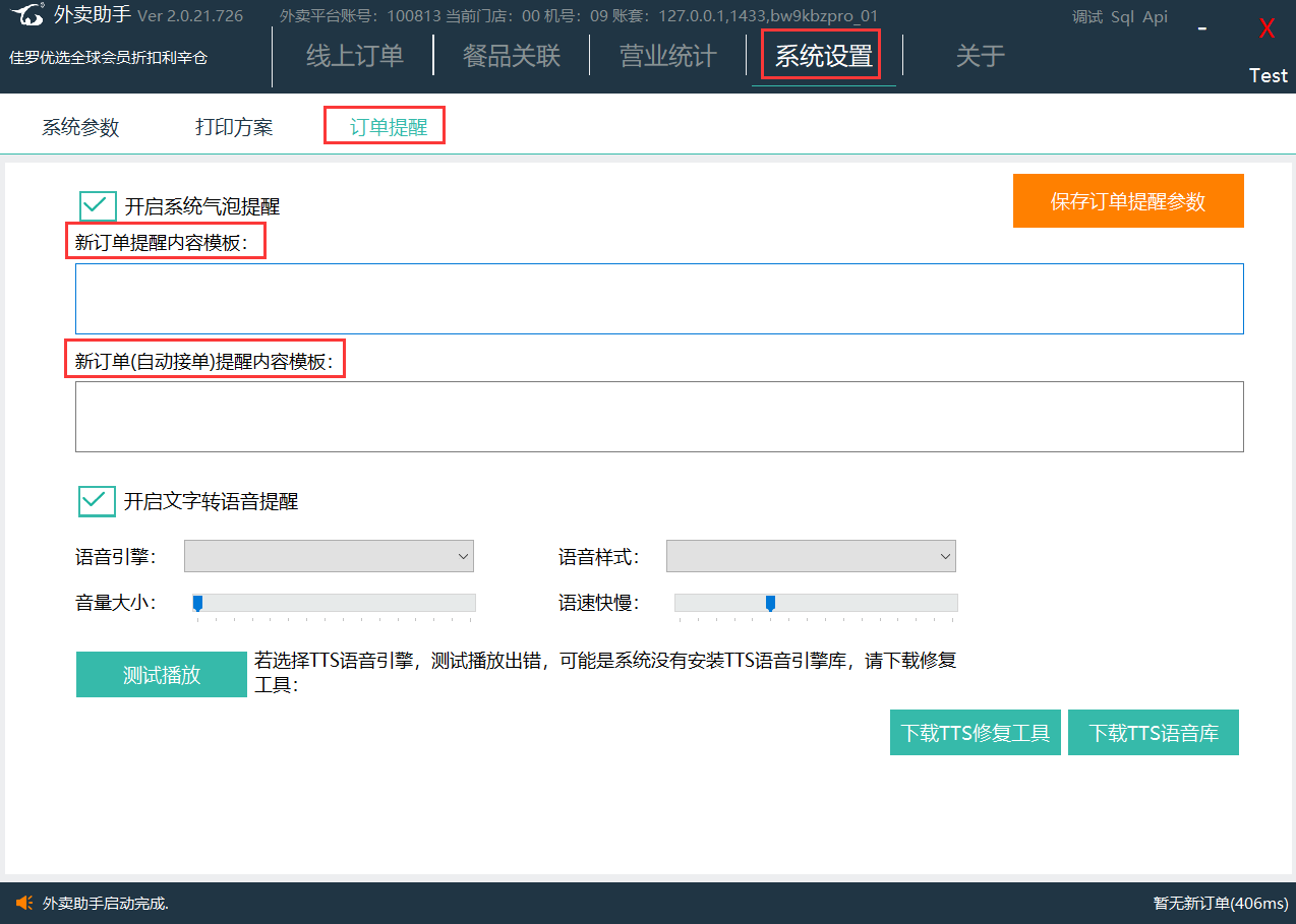 在系統(tǒng)參數(shù)語(yǔ)音播報(bào)里,可自行編輯來(lái)新訂單的語(yǔ)音播放內(nèi)容。